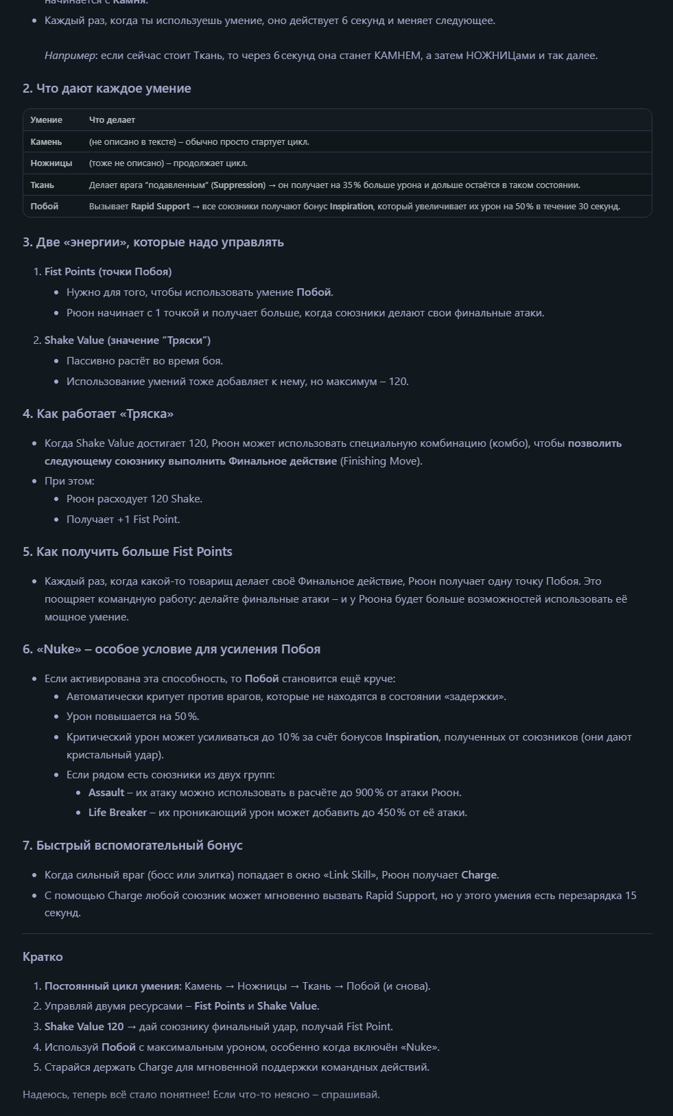 >>5738262 >>5738270 Спасибо, но я не об этом. Она бонусы урона за какие-то действия даёт? Если её пиздить двумя нападаторами - дополнительные эффекты будут? Ну и там вроде как два парирования, если поймать 1-2 (она после этого еще и упадет отдохнуть, можно побить чутка), а если первое проебать, то надо уже 3 парирования делать (а может и больше, на самом деле, не помню)