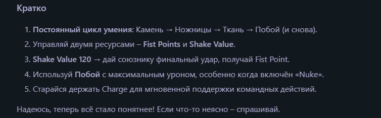 >>5738315 Ну мы же говорим об Изольде? Бей, уклоняйся. Парируя атаки ты теряешь демедж. Словить одну желтую вспышку на условной Тригге можно чтобы капнуло чуток ДЦБ+стана по Изольде, дабы когда она выйдет из стана, тутже ебануть в нее ультой/либо ебануть в стан для демеджа, тут уж смотри что тебе надо.