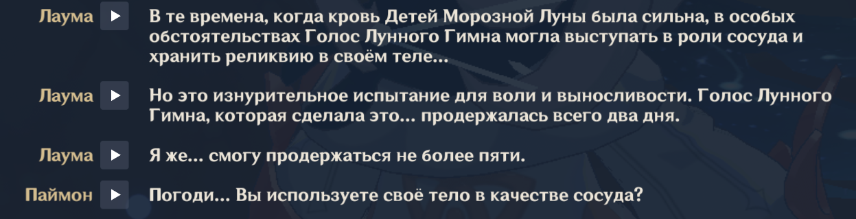 О Лауме Наша милосердная и непорочная госпожа Голос Лунного Гимна, она столь полна сострадания, доброты и нежности, что каждому хочется быть к ней ближе. Даже звери, проходя мимо, жаждут прикоснуться к её руке. Но помни об осторожности и не подходи слишком близко к Лауме, иначе рано или поздно окажешься среди её обращённых последователей. Всё ясно. Она уже тебя обратила