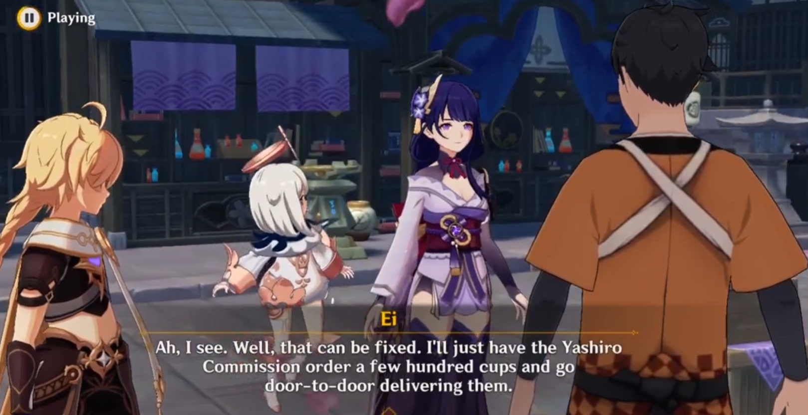 О Е Лань Госпожа Е Лань, пожалуй, является важнейшим клиентом нашего Куратория тайн... точнее, Северной разведсети. Когда она покупает сведения, то всегда расплачивается наличными единовременно — не оставляя мне ни малейшего шанса для торговли «в долг». Даже за самую ценную и запретную информацию она без колебаний выкладывает вдвое или втрое больше моры, пока её щедрость не заставляет меня капитулировать и передать ей всё, что она желает. В Ли Юэ всегда платят щедро. Хорошо иметь такие возможности...