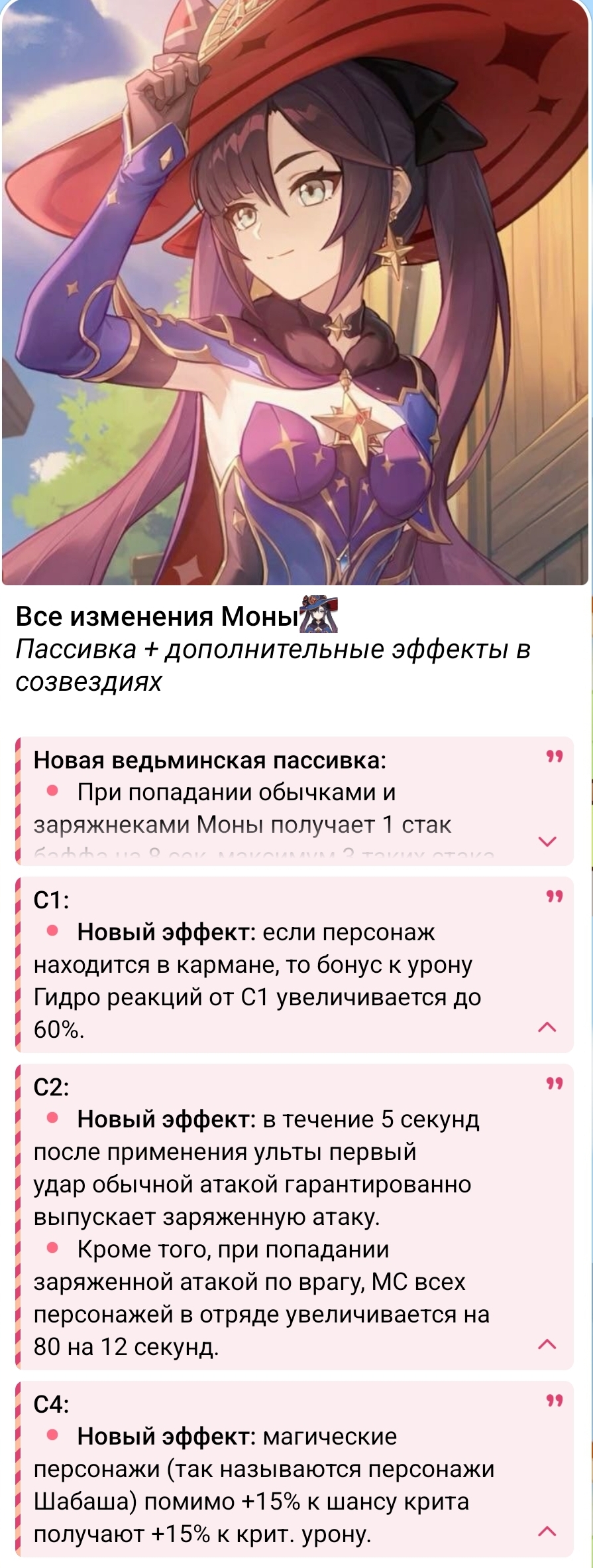 Эта Мегистус какой-то оч сильной кажется. Если она ДД, то у нас: Омен длится 13 секунд, то есть всю ротацию. Омен это 84% дамага. Первые пять секунд после Омена Мона ебошит 30к-35к с руки без учета реакций со скоростью пулемета. А так же раздает 80МС всей пати включая себя. Пассивно бустится на 15% кш и ку, так же бустит всех шабашевцев, ту же Фишль.