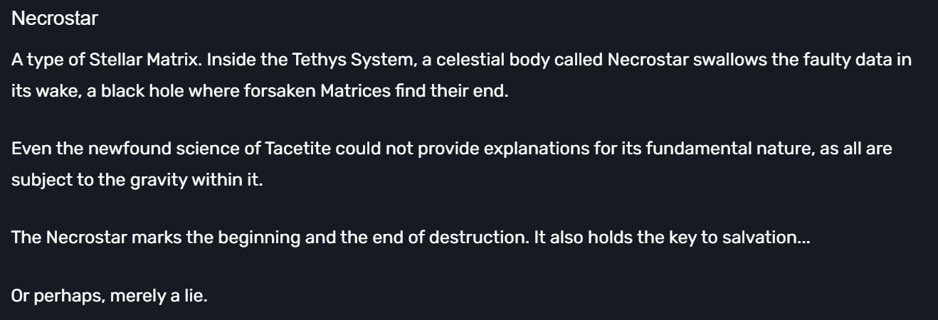 >>5772902 В одни моменты некростар это как условная урна для говноданных в рамках тетис системы, и в вики это так же обозначают (хотя там расплывчато), в другие моменты она говорит, что это те самые данные из портового города. Я так понял это с флешки которую нам полторашка дала, но тогда это похоже на какой то вирус, а не механизм системы для утилизации отходов. В другой момент она говорит что хуевые данные не такие уж хуевые она может их поправить. В целом мы сейчас в виртуальном пространстве? Но тут так же красным коррозит людей как и снаружи это произошло. Вообще красная поебота взлома жопы манифестируется как в реальном мире так и тут. Ладно я пока паузанул, потом допройду, может позже всё это объясняется, но я ебал китайцев и их манеру подачи шорка миленькая глейзинг выводит на новый уровень
