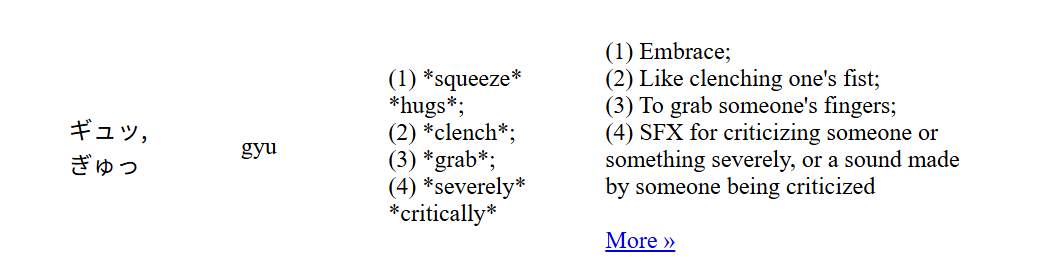 (1) сжимаюобнимаю; - (1) Объятия; (2) стискиваю; (2) Как сжатие кулака; (3) хватаю; (3) Схватить чьи-то пальцы; (4) сильнокритически (4) Звуковой эффект для резкой критики кого-либо или чего-либо, или звук, издаваемый критикуемым.