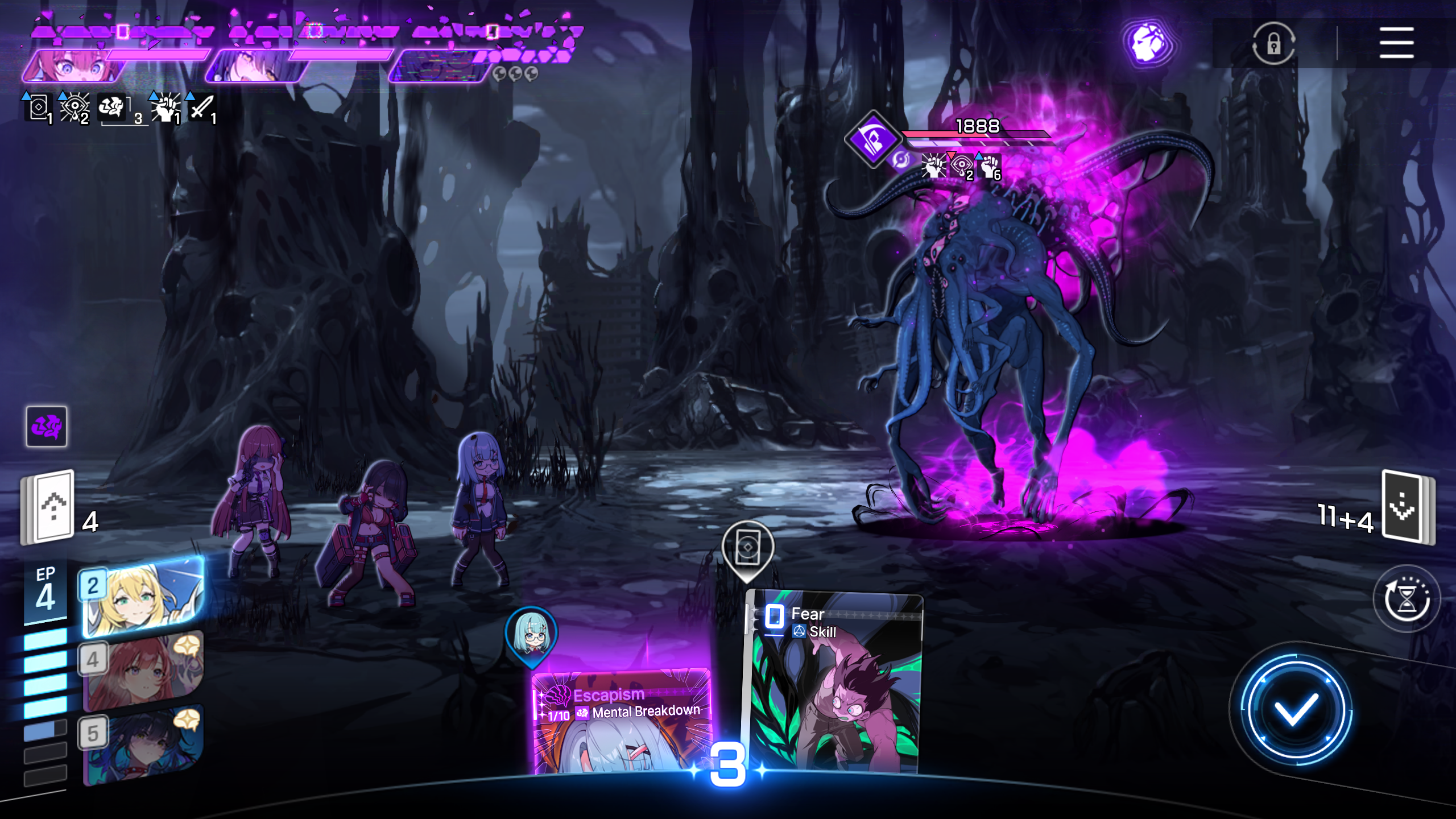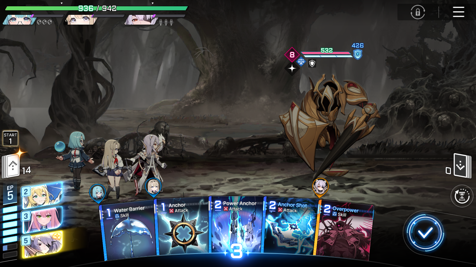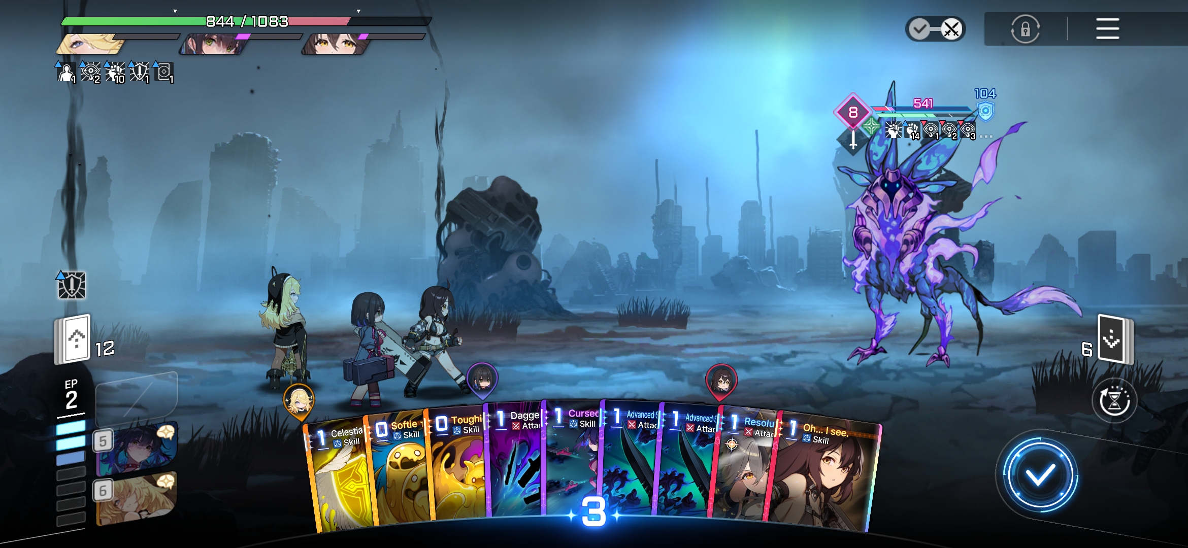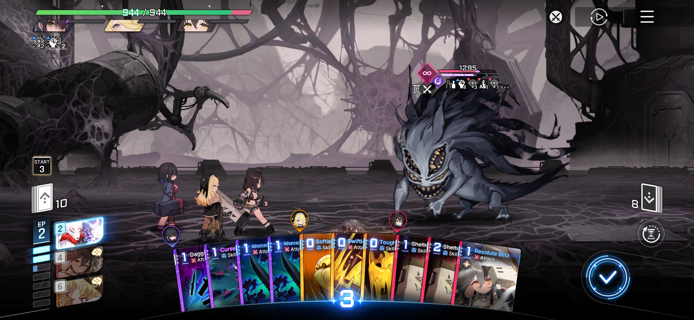 Хард баттл мишн уже иногда требуют смену подхода. Удержанные или дорогие карты против противников с чем то опасным на счетчике действий, команда с добором карт с выносом шкалы почти в ноль групповой атакой и потом цепная реакция сингл атак через +1ап за полный вынос, спам тычек чтобы переводить атаки в что то другое через счетчик действий, или бафф Тесс для дотов во все поля. Такая игра вполне себе зайдет и не как гача.