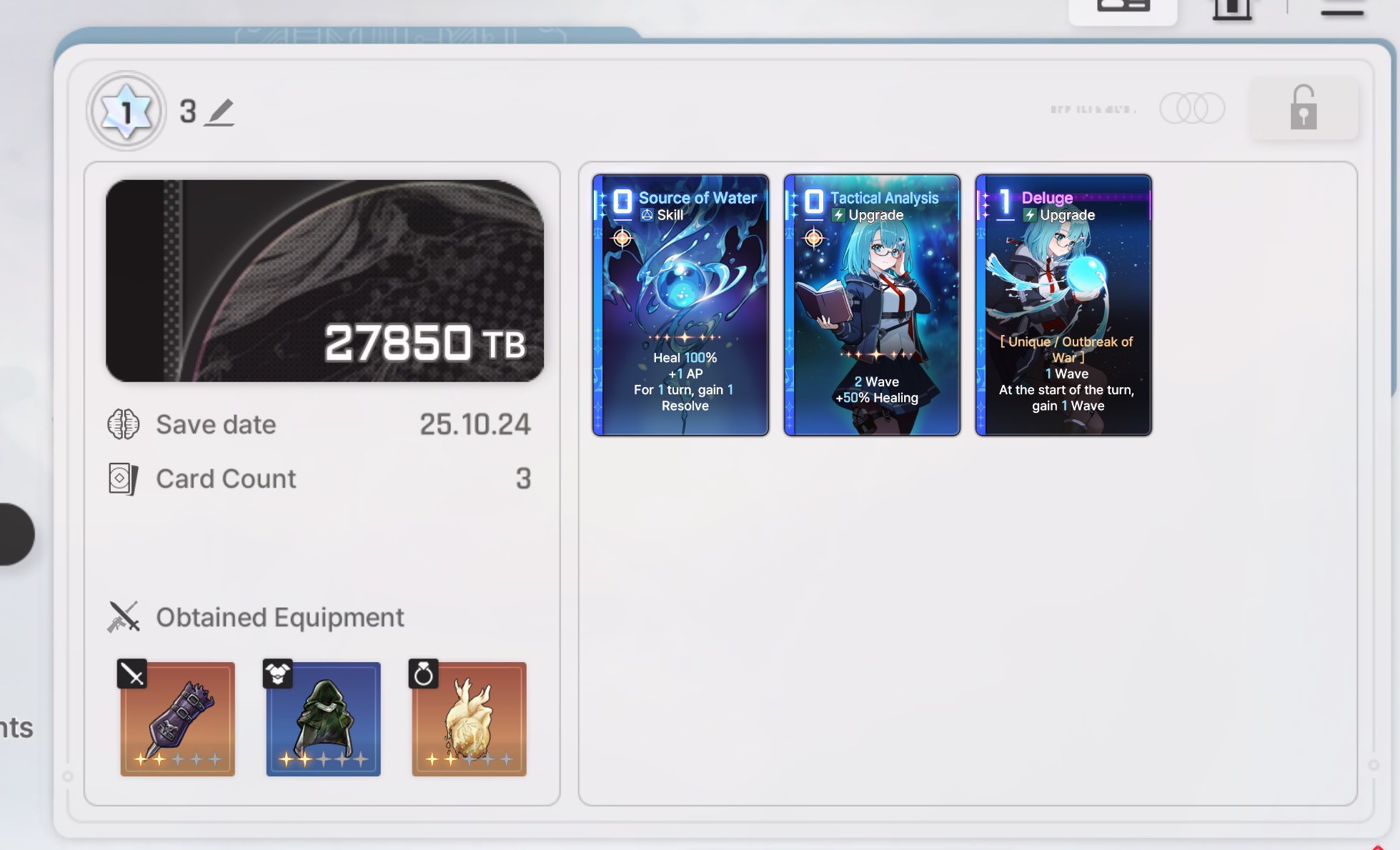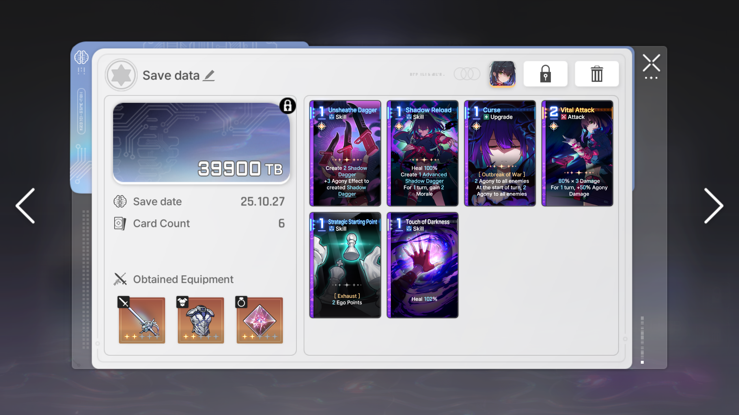 >>5790464 Команды у меня пока собираются из синергии между сейвами а не самими персонажами. Потому что нейтральные карты иногда довольно сильные, вроде 300% урона от защиты + дебафф или однократный добор трех карт или заморозка счетчика действий у противника.