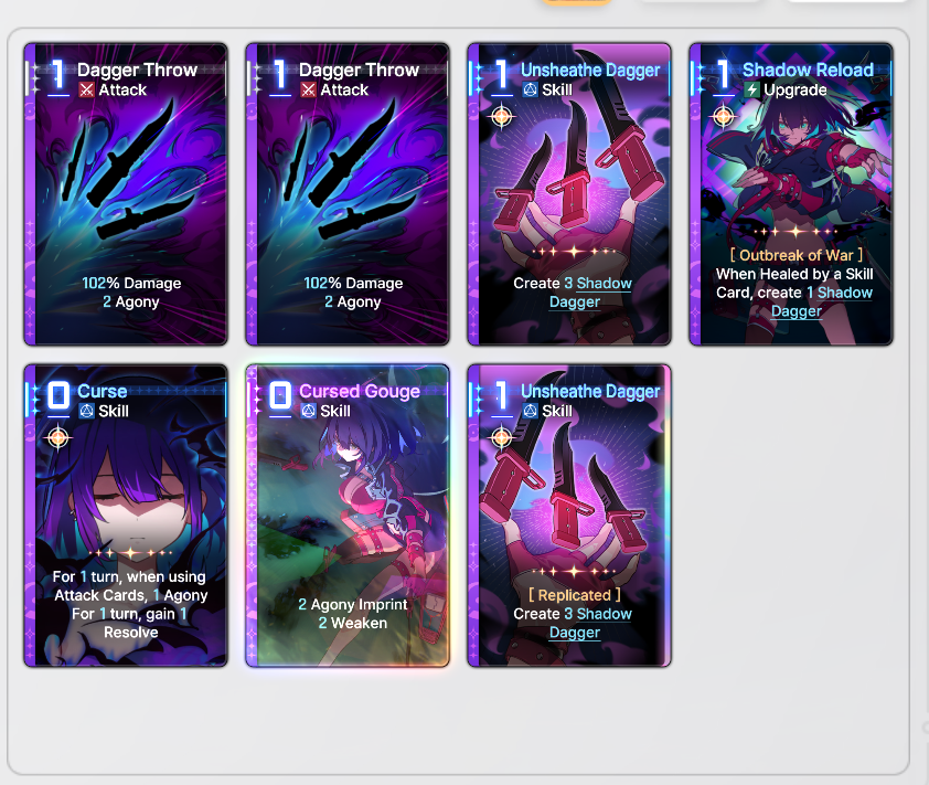 >>5777761 У кинжала пассивного эффекта от оставления нет - он просто не уходит из руки. Это у карт монашки хил или увеличение урона когда оставляется. И монашке надо апгрейд, чтобы и на чужие работало.
