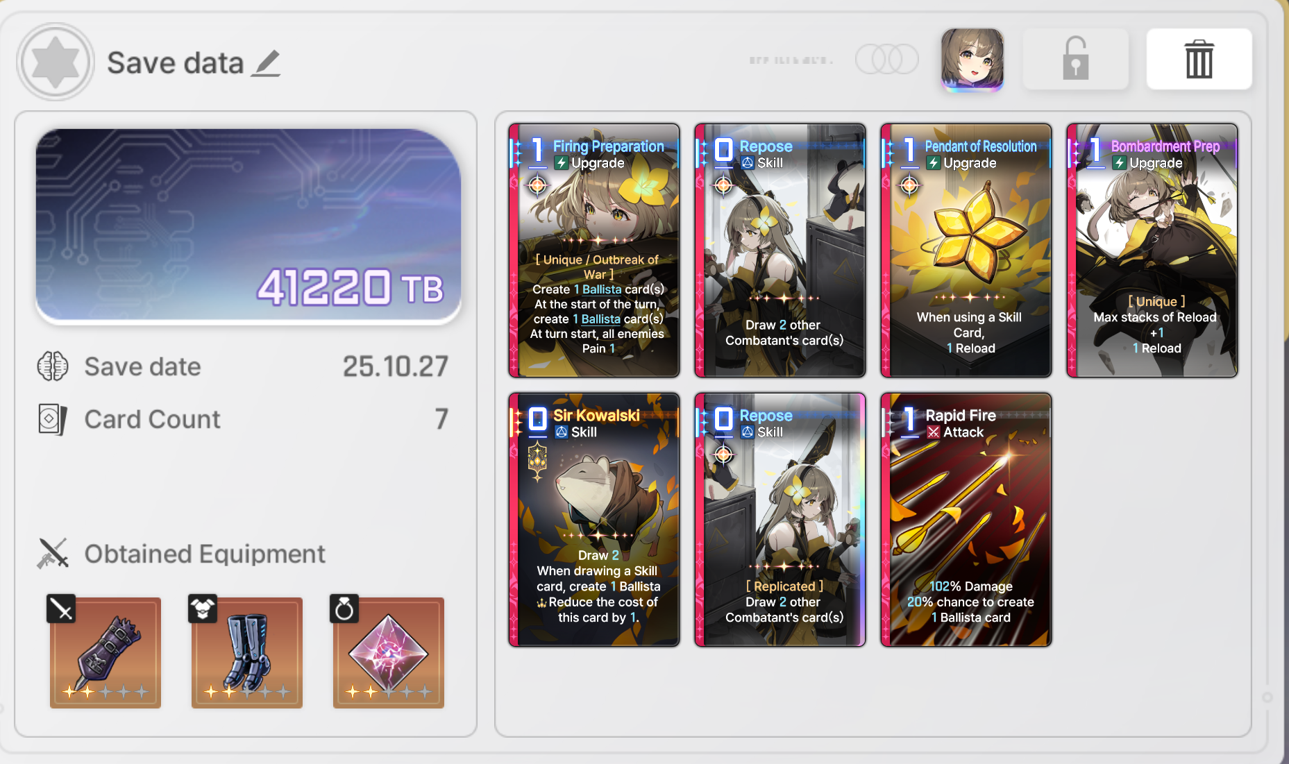 Ну вот типа билд с 6 картами - все равно выглядит как кал, алсо дата несаейвилась правильно, апгрейды слетели Вот например справа билд зайца - в разы лучше потому что важные апы засейвлены - 2 базовые карты небольшая проблема