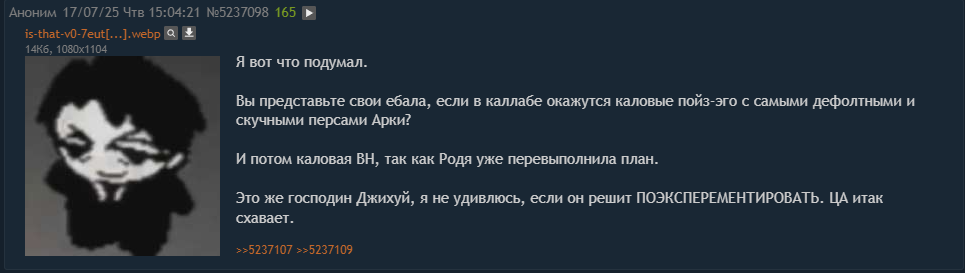 Хотя лично я рад, что Джихуй хотя бы не устроил анальный паверкрип с айди какой-нибудь Ксяо или че там вкакашечки коупили на эту тему. Это значит, что все еще есть шанс выхода айди на Сальвадора или кого-то еще из прикольных челов из ветки Филлипа: Юны, Оскара, лоли-клонов. Если бы Жэхуй реально скипнул сразу до Звезды Города, то я бы неиронично удалил свой аккаунт.