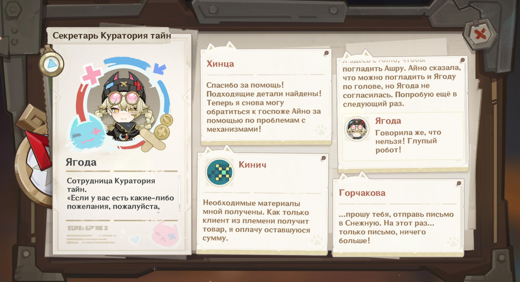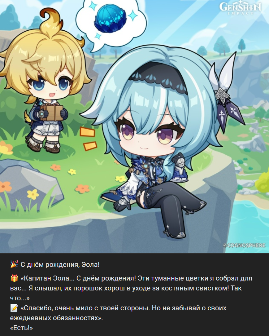 🎁 «Капитан Эола... С днём рождения! Эти туманные цветки я собрал для вас... Я слышал, их порошок хорош в уходе за костяным свистком! Так что...» 📝 «Спасибо, очень мило с твоей стороны. Но не забывай о своих ежедневных обязанностях». «Есть!» 🐇 Торт в форме Барона Зайчика и Додоко... Наверное, вы испекли его вместе с Эмбер и Кли? Так вот почему в прошлый раз за ужином Эмбер всё допытывалась, какие у меня любимые тортики. 🙏 Пора загадывать желание? Да нет, зачем... Эм, Кли, не смотри на меня такими жалобными глазами... Ладно, ладно, если обязательно нужно что-то загадать... В следующий раз, когда соберётесь печь торт вместе, возьмите и меня с собой?