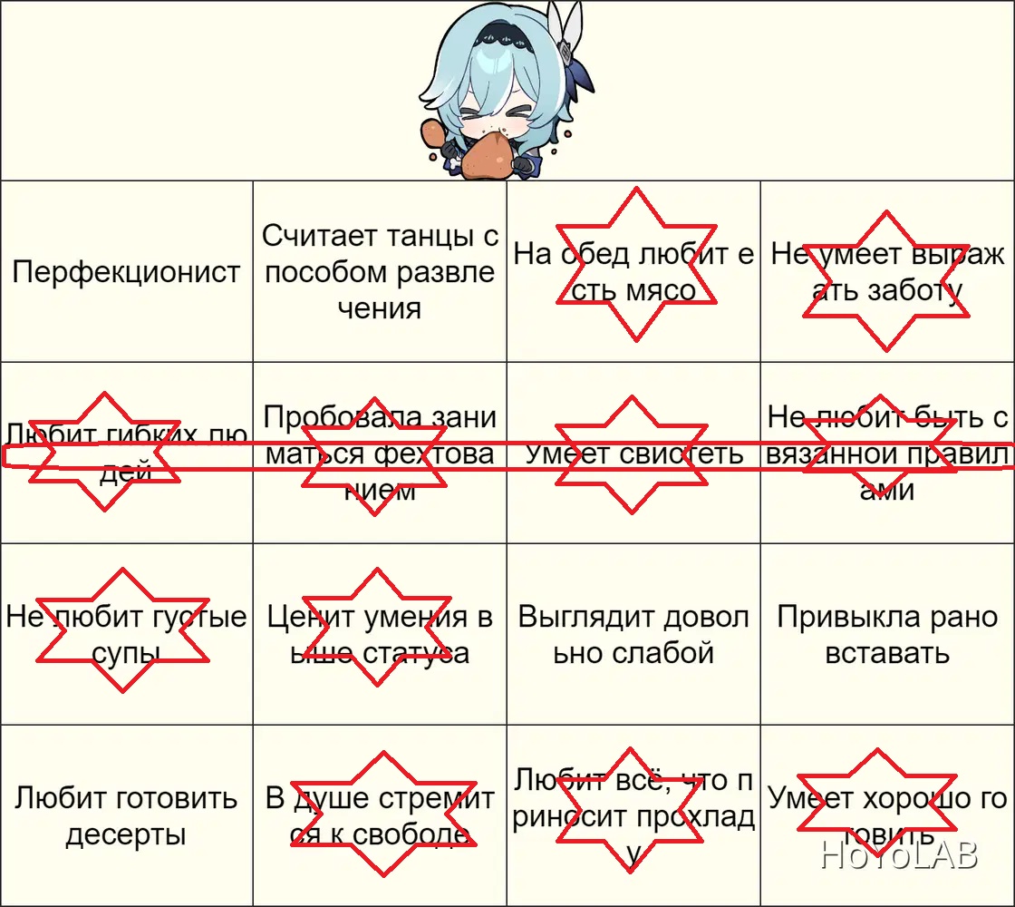 Правила: 1. Пустые поля на изображении заполнены разными характеристиками, так или иначе связанными с Эолой. 2. Отмечайте характеристику, если вам кажется, что она вам подходит! Закрашенные клетки, выстроенные в линию, покажут лучшего кандидата на должность заместителя Эолы!