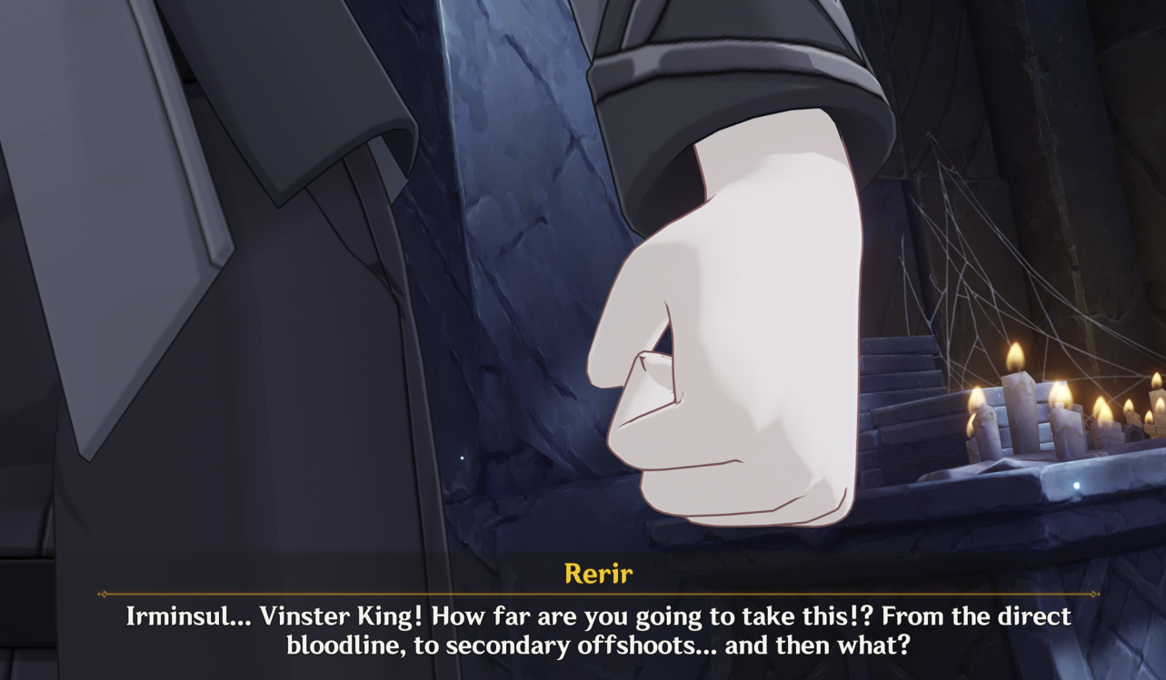 Рерик в этой ситуации представлен именно что классическим эшником, работником таких организаций, который особо не заморачивается с тем, в чём суть приказов, есть чёткий список задач и критериев, он по нему и работает. Угрызений совести не особо испытывает (пока дело не касается его лично, или близких ему людей). С точки зрения среднего обывателя или зрителя со стороны (среднего игрока, т.е.) мразь и убийца без чувств, но с точки зрения какого-нибудь хардкорного государственника-лоялиста, которого полностью устраивает курс этого короля Ирмина, Рерирчик - хороший государственный служащий, честный работник, выполняет дело по защите страны от внутреннего врага. "Закон суров, но это закон", и всё такое. Для начальства так вообще, человек-золото.