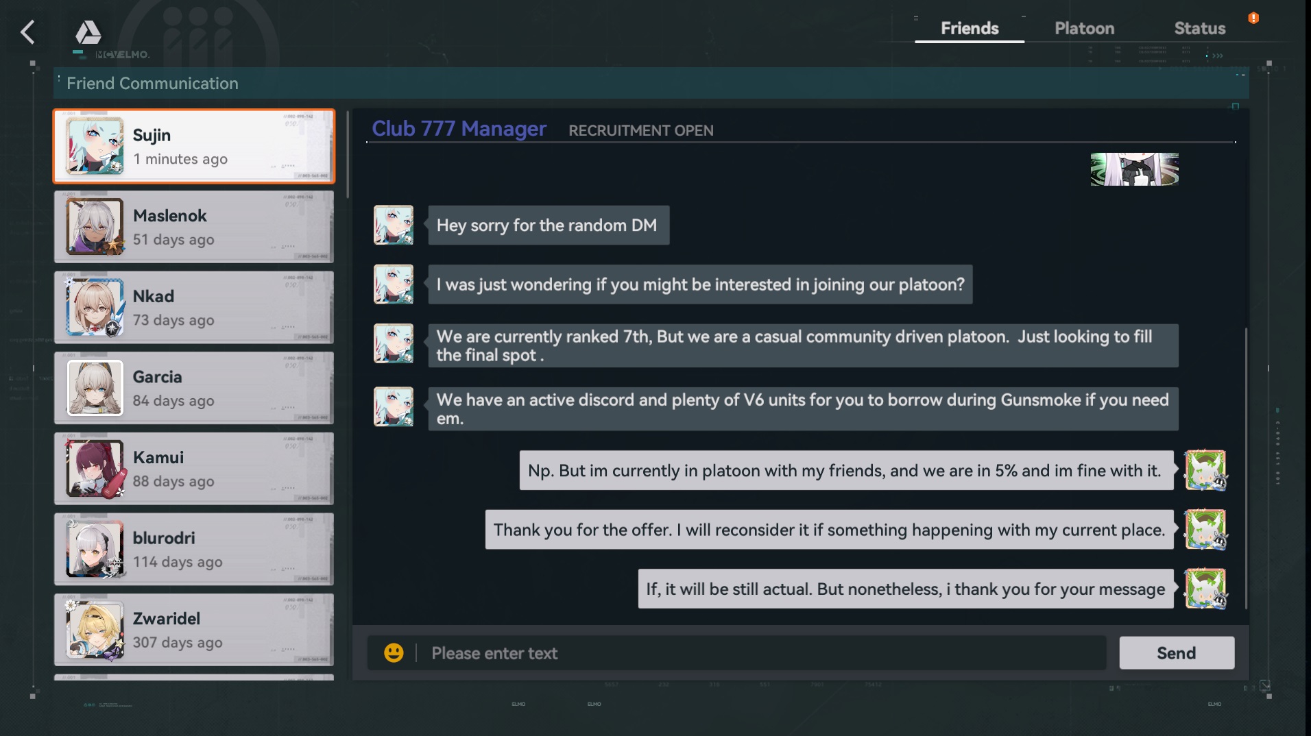 Следующая кукла, Сакура, будет завязана с механиками своего фургончика, по типу механик Клюкай и Воймастины. Южмых, знает, что игрокам нужно больше свободы и хочет сделать как можно скорее возможность через меню шопа забрать все ежедневные награды разом одним нажатием. Сейчас заканчивается разработка идеи не 20-ти, а тридцать дневного промежутка между выходом контента на Китае. Это позволит притормозить китайский сервер и ускорить глобал. На недавнем совещании, представители Санборн были недовольны финансовыми показателями игры и сейчас идет дискуссия как это можно исправить. В разработке две концепции сосредоточится на выпуске крупных мажорных обновлений раз в 3 месяца с огромным количеством контента как это было с Искрой или сосредоточится на глобале, а именно на продвижении игры в еще не охваченных регионах с привлечением региональных плюшек. Южонг, хочет провести коллаб и Делта Форс.