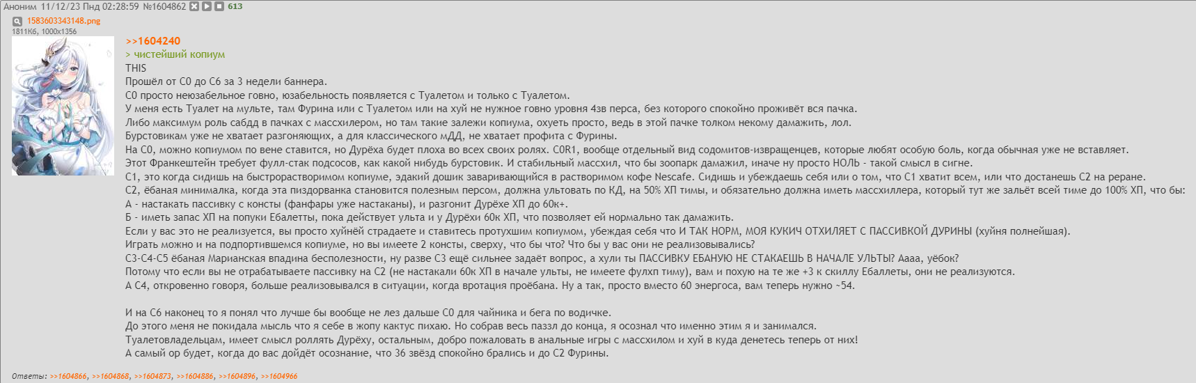 >>5802119 → > фурину нет смысла крутить в нынешней мете Забавно, прочитал пост, и прям до этого скриншот читал, ожививший память о Богине. Фурину никогда не имело смысла крутить, кроме как раз и навсегда закрыв гештальт с C2. Ниже бесполезно, было и раньше, а сейчас, особо глупо. Выше, просто проёб гемов, а сейчас, на фоне того как могут высрать новых ебак, вообще бессмысленно. Я скажу так, если C2 добирать, оно того стоит, потому что это будет рабочий перс в ебанариуме, как минимум, если же только только её доставать, то нахуй не нужна!