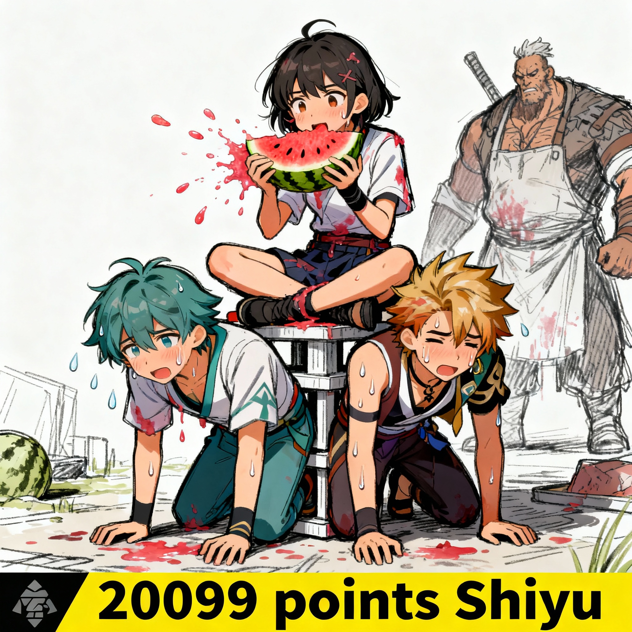 Пусть нарисует Мияба которая жрет дыню жоско прям во все стороны соки брузжут и сидит свесив ноги на спине Янаги и Юзухи, они стоят на коленях друг на дружке башней. На фоне стоит дохлый мясник или этот с рукой босс, внизу плашка 20099 поинтов шию. Янаги и Юзуха прям пиздос потеют пока держат башню.