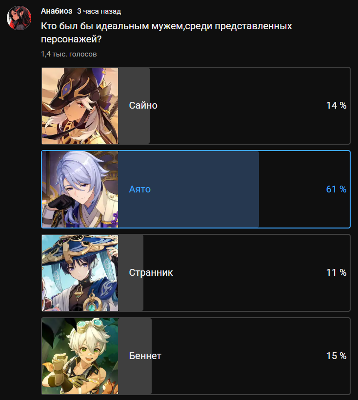 >>5807024 А тут выбор есть? Сайно только об игрульках своих думает и идиотских шутках, такой явно не будет хорошим отцом. Куча просто избалованный ребенок. Беннет аналогично, еще совсем мальчишка с романтической фигней в голове. Нормальный, полноценный мужчина здесь только Аято.