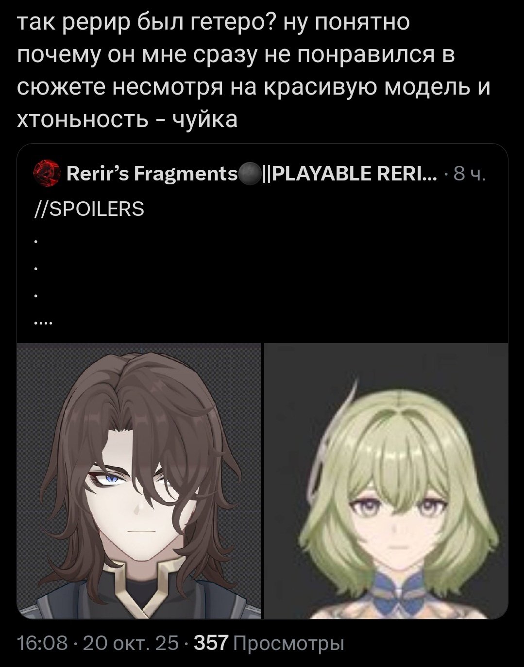 Рейндотир гнида явно, но в последнее время курс на отмыв. Алиса та же сотона что и чел выше с "прогресс важнее жизней". Но это не важно, ведь у них вагина, а значит потенцильно, возможно, может быть она бы мне дала и я бы получил аниме тяночку ух ух уиииии.