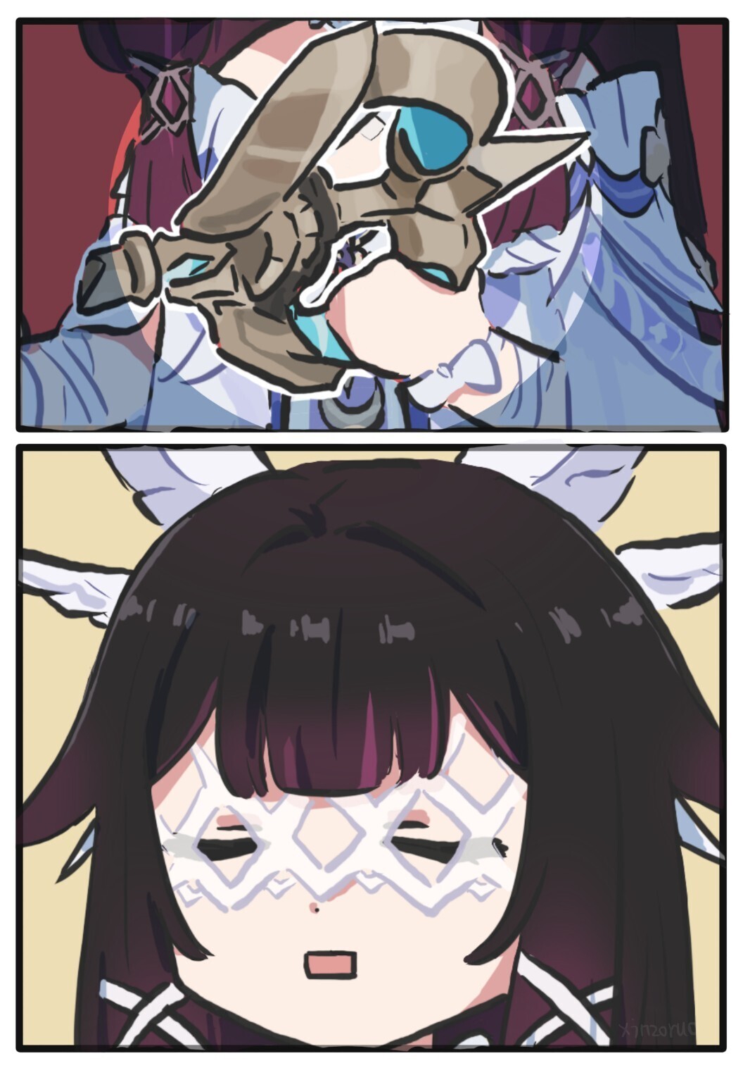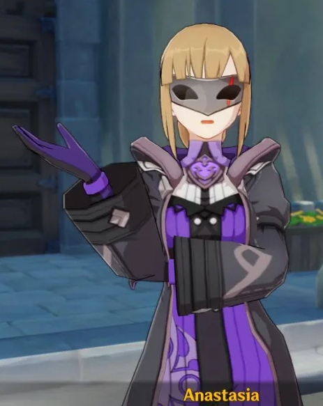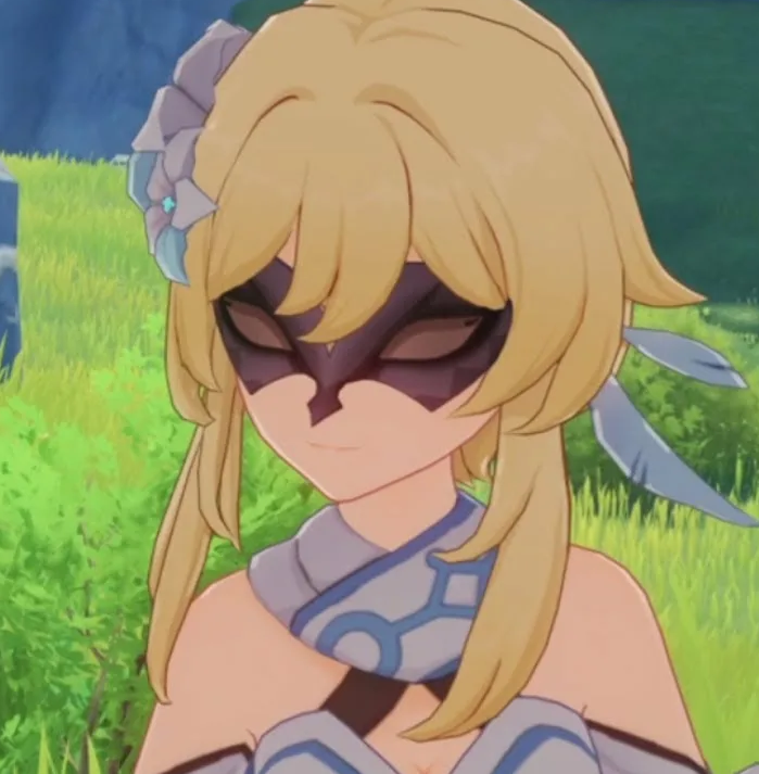 Держи, вот твоя маска фатуев... Правда, в связи с тем, что у нас нехватка одного предвестника, который недавно сбежал, выдадим тебе как раз таки масочку из её забытого гардероба. Слегка поношена и пахнет Субреткой, но надеюсь ты не против. Это всё равно в некотором роде маска фатуев.
