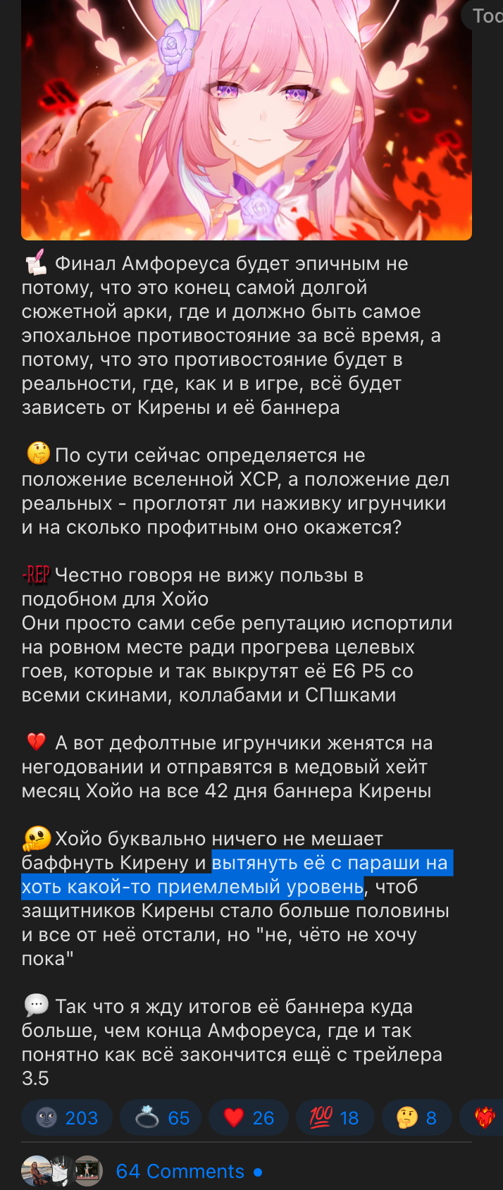 То есть Кирена НЕ Т5 юнит. НЕ мусор. НО. Она балансная. Требует конкретные чёткие пачки и планирование на будущее касательно её эйдолонов, с чёткой расстановкой приоритетов. Тебе нужен самый сильный Анакса в мире? Е2 Кирена мастхев. В пачках Памяти она будет играть. НО. Тьмарт приоритетнее для пачек Памяти. И проблема в том. Что Тьмарт на Е2 дамажнее Е2 Кирены. Правда я не вижел Киерну с 240 спд, что у неё в капе, мб оно меняет положения вещей. Но не отменяет факта, что Тьмарт кап своих стаков имеет в 999.