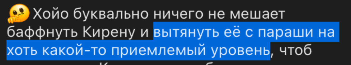 >>5817065 Те кто не особо шарят в игре правда ведутся что Кирена слабая, лорный протык вон буквально пишет что она уровня параши. И главное распространяет это ошибочное мнение среди таких же хлебушков.