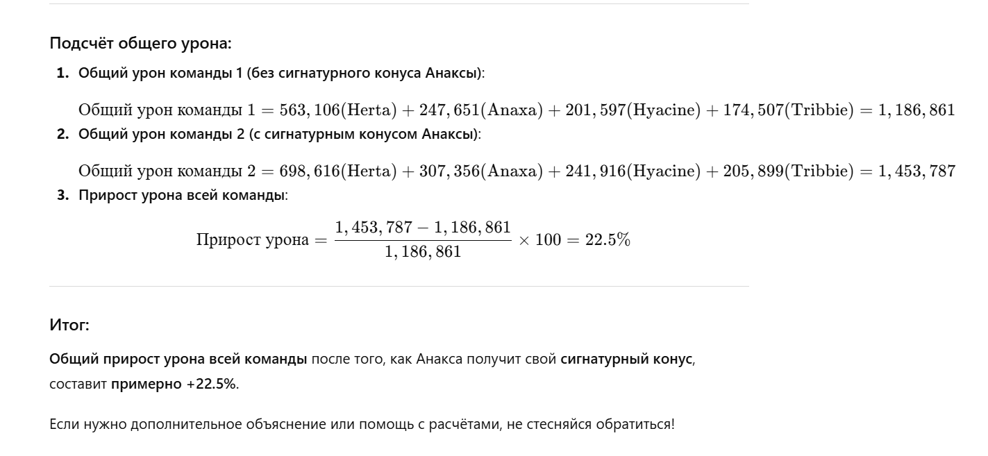 Как фанбой Великой Герты не могу успокоится насчет сигны анаксе. Оптимайзер дает 23%, мд калькулятор 22% увеличения урона всей команды герты. Понимаю что это тупо и инвалиду e0 фаенону сигна будет нужнее. Дошел до софт пити если выпадет хорошо, не выпадет будет гарант на фаеноновскую сигну пусть гача за меня решит.
