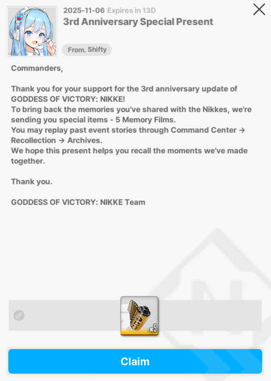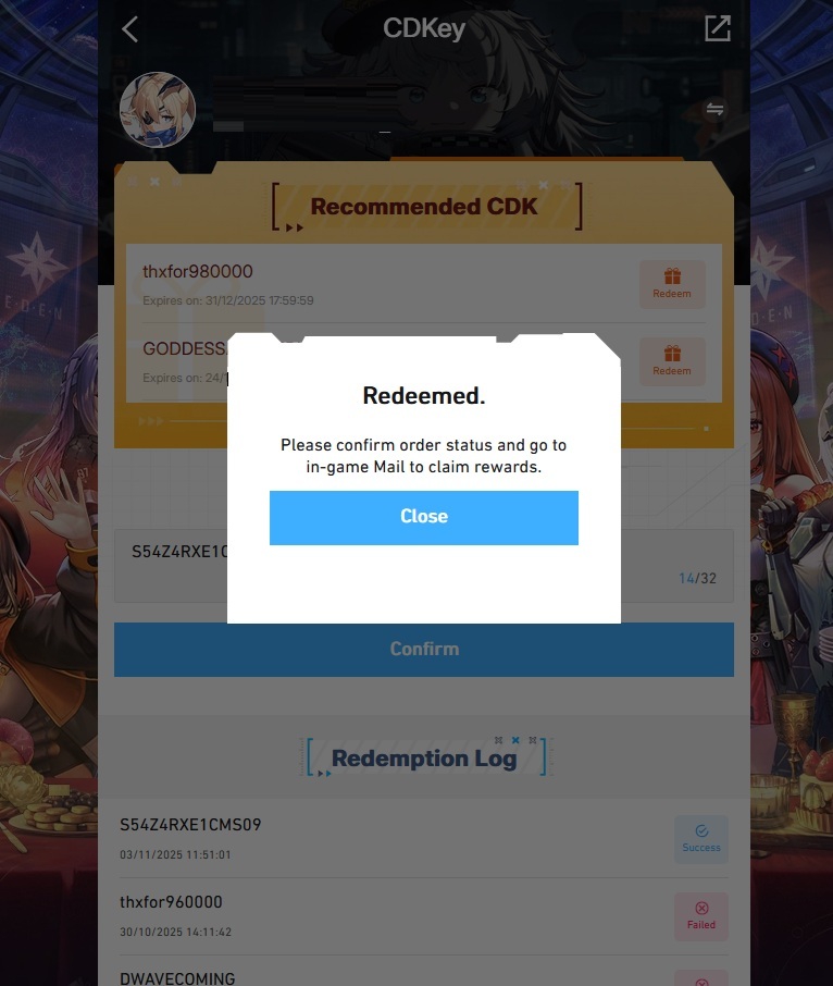 3YEARSWITHNIKKENov. 510 x Recruit Voucher NEW 3YEARSWITHCOMMANDEROct. 25900 x Gems 1 x Advanced Recruit Voucher PUNYQUEENOct. 2510 x Advanced Recruit Voucher IAMNAYUTAOct. 255 x Recruit Voucher