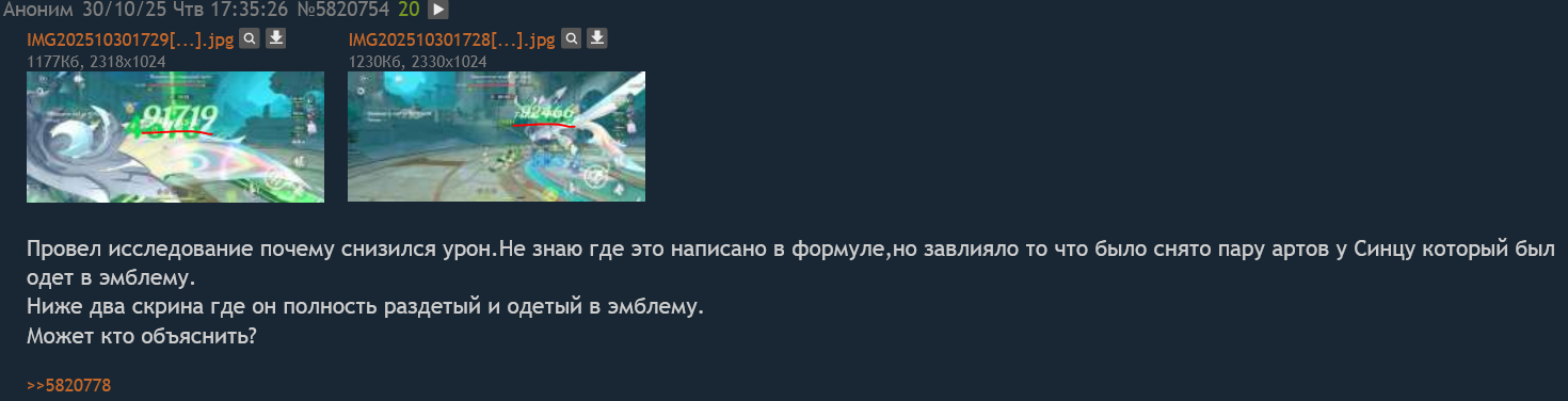 Провел исследование почему снизился урон.Не знаю где это написано в формуле,но завлияло то что было снято пару артов у Синцу который был одет в эмблему. Ниже два скрина где он полность раздетый и одетый в эмблему. Может кто объяснить?