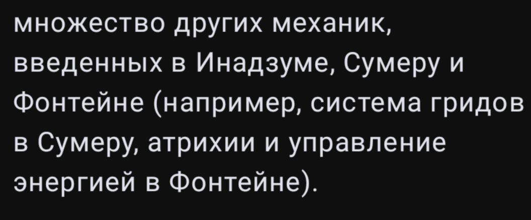 >Дохуя вам Иназума, Сумеру и Фонтейн добавили в плане геймплея? На ум приходят только душные головоломки Субъективщина. Мне нравятся головоломки, особенно инадзумские - топ я считаю, веха экспериментов, интересных решений и творческого взлёта. Один квест библиотечный в Энканомии чего стоит.