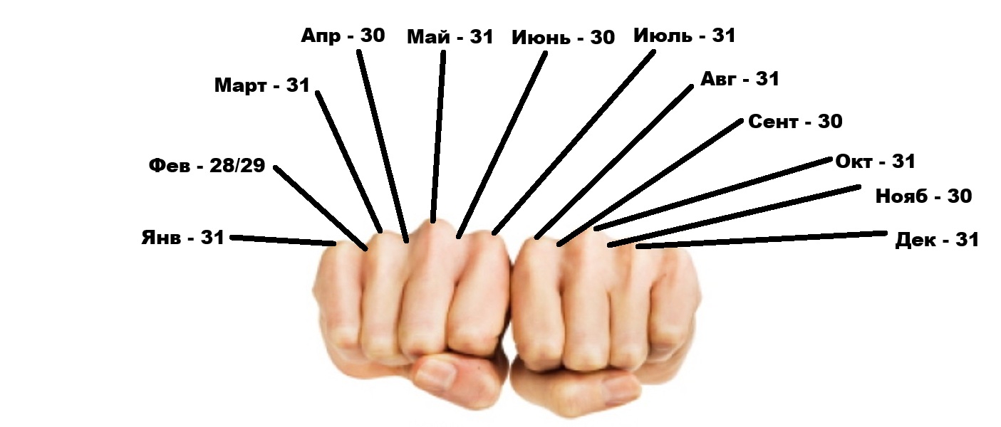>>5823268 По костяшкам, кстати, раньше детей учили запоминать какие месяцы длинные, а какие короткие. Костяшка - 31 день. Впадина между костями - 30 или февраль. мимо пенсионер