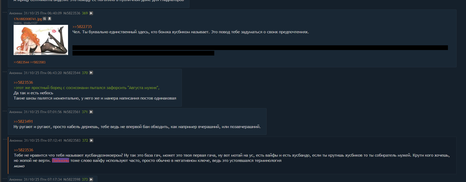 >>5822735 Чел. Ты буквально единственный здесь, кто бомжа хусбиком называет. Это повод тебе задуматься о своих предпочтениях.