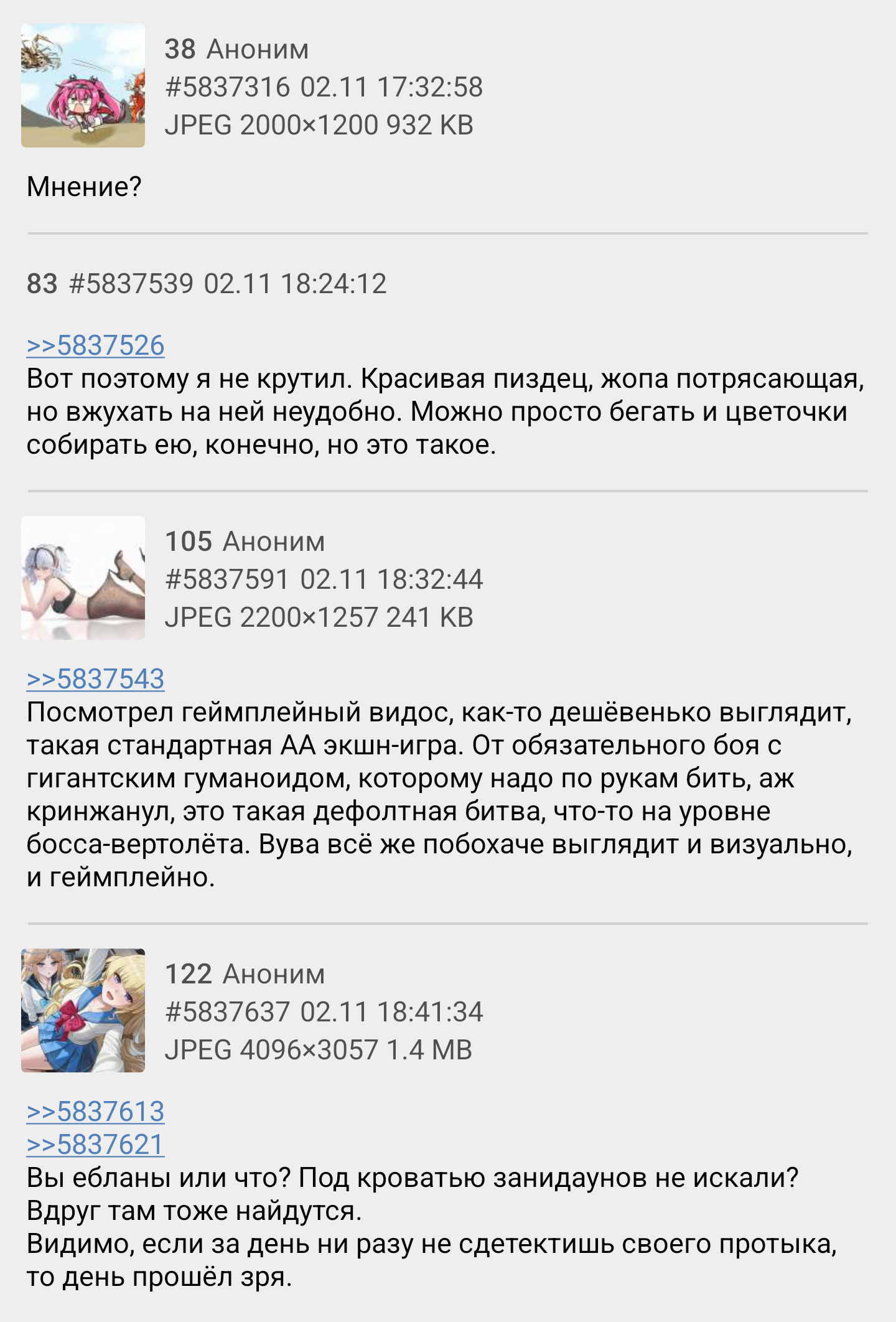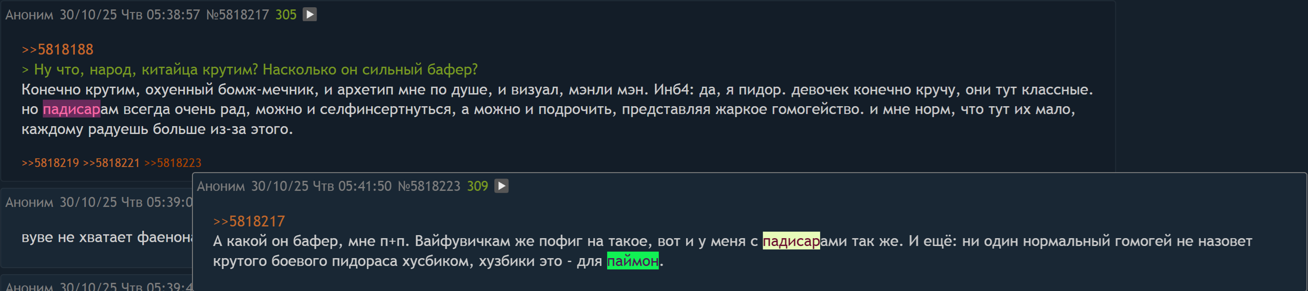 Причем все это одни и те же люди генерируют часто меня стороны, маски. Сегодня один накидывает под маской зани, потом завтра меняет ее и накидывает на "занидаунов", потом думпостит будущими сосисками, расширением и уменьшением юшек, а на следующий день он уже сосискошиз и называет всех кто их выкрутил - пидорами. Ну и послезавтра он начинает срачи за пол гг или за рост гг "рофлит" над "узбеководами ицнелами вырожденцами", а после-завтра ищет чулочников. И так кучка людей меняется ролями и семенит до бесконечности.