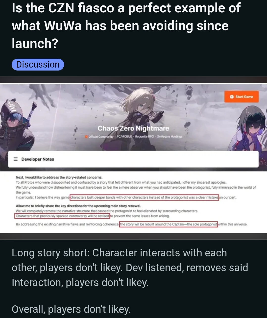 >>5838003 Двачую. Формула для таких игр уже давно обкатана на гавнише, отход от нее будет воспринят в штыки. Можно сделать немного другую боевку, можно сделать немного другой эксплоринг, но формула "прошел сюжет - понюхал карту (этот этап скипается если игра аренкокал) - заходишь каждый день на 10 минут сделать говноивенты и дейлики - ждешь нового патча - опционально траишь эндгейм (80% игрунков его даже метровой палкой не тронут)" уже укоренилась в головах гачапорков.