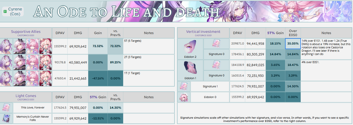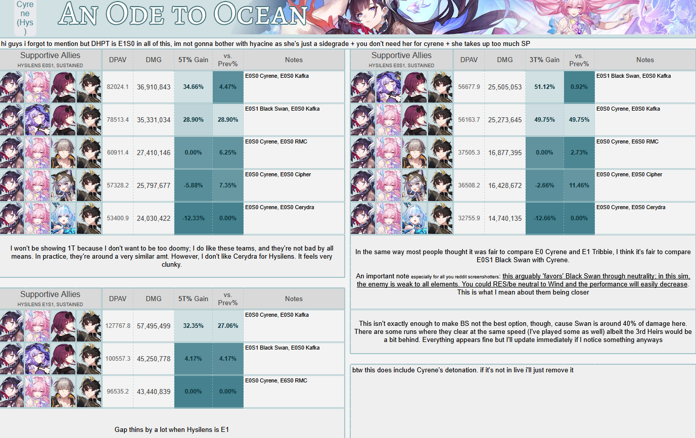 По Гисиленсе тоже вышло. Ожидаемо результат будет варьироваться от условий и врагов. Лебедь хороша в 1-3 таргета. В аое и арбитраже Кирена впереди. На е1 Гисиленсе отрыв сильно усиливается в пользу Кирены. пс. лебедь с сигной, а кирена без, так что тут однозначно апгрейд для равной кирены с сигной