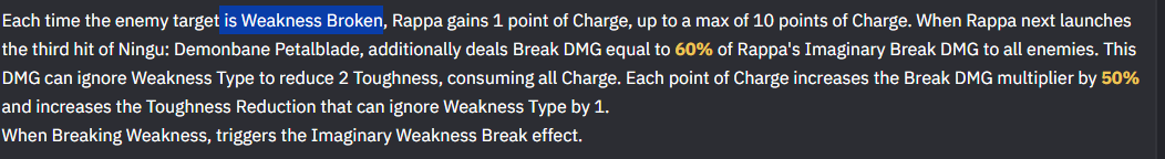 Фуа есть. Бафф брейк ефишенси в 100% самой Писяо теперь работает. During this time, can ignore Weakness Type to reduce the target's Toughness. When the target is not Weakness Broken, Feixiao's Weakness Break Efficiency increases by 100%.