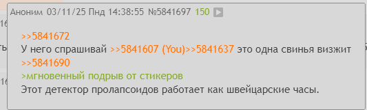 >>5841672 У него спрашивай >>5841607>>5841637 это одна свинья визжит >>5841690 >мгновенный подрыв от стикеров Этот детектор пролапсоидов работает как швейцарские часы.