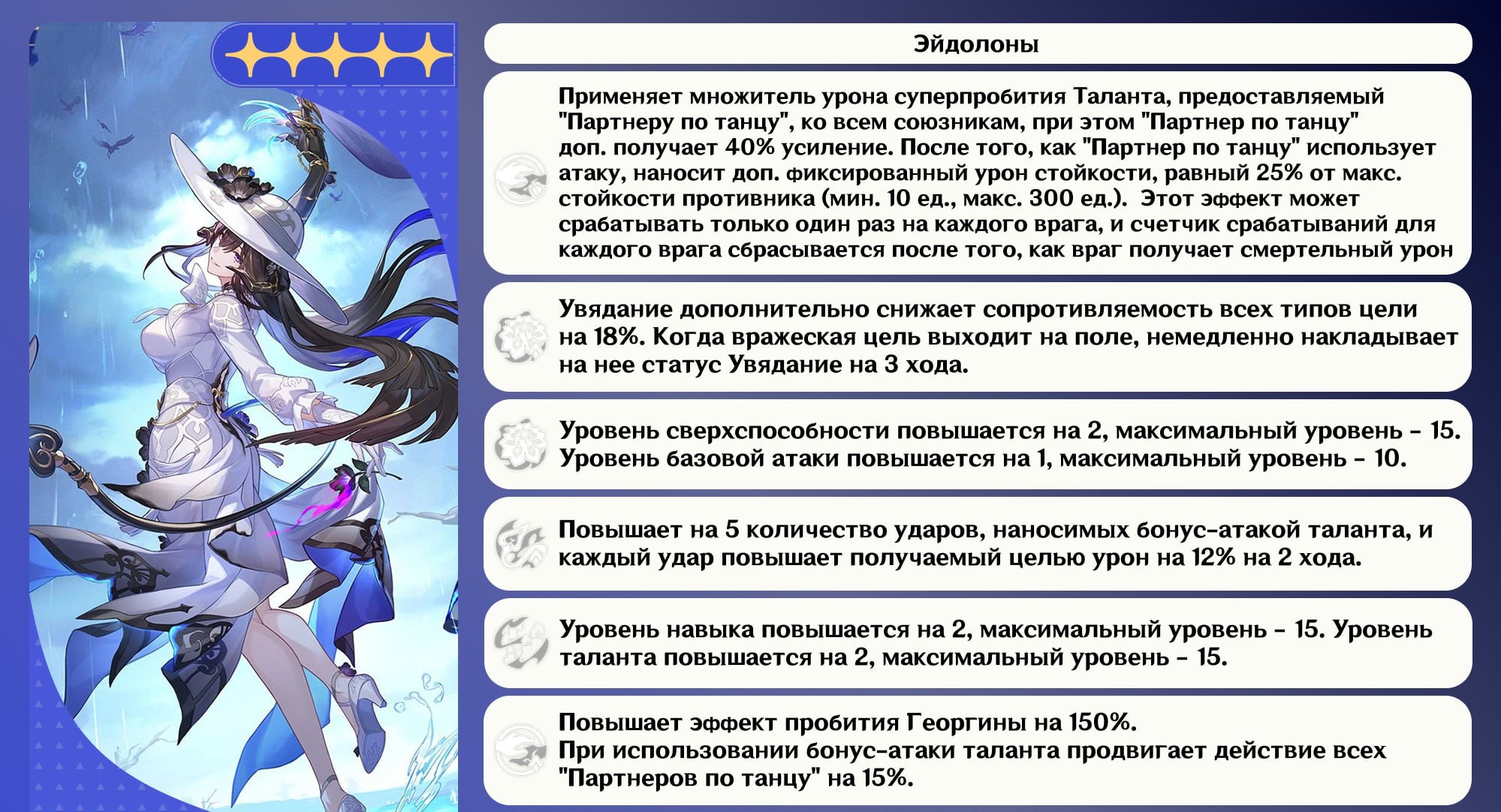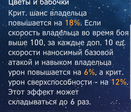 >When entering combat, increases other characters' Break Effect equal to 24% of The Dahlia's Break Effect plus 50% for 1 turn(s). This effect triggers again lasting 3 turn(s) when The Dahlia receives healing or a Shield from a teammate, but cannot be triggered repeatedly within a single turn. А тут выдавливают Жучку, впрочем кажется Жучка все равно даст больше пачке чем этот баф.