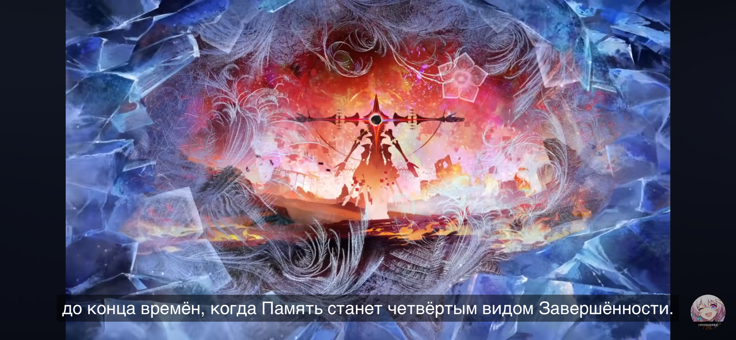 >>5842948 >>5842937 >>5842990 >>5843208 Какое же жопочтение.. Кирена не становится эоном и тут же не замораживает Вселенную. Прямым текстом говорится что это происходит в конце времен. А в видео происходит следующее, ггшка вместо спасения Вселенной от сталесклепа выбирает спасти память амфореуса и окукливается в манямире памяти, вот на арте - от ретроспективы ггшки, все что вокруг неё замораживается, а реальный мир где бушует сталесклеп далеко далеко. После же происходит всё как говорила темень, Фули поглощает труп Нус, что запустит неминуемый процесс - который приведет Вселенную к завершенности от памяти в конце времен.