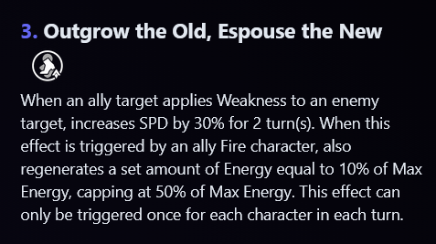 >When an ally target applies Weakness to an enemy target, increases SPD by 30% for 2 turn(s). When this effect is triggered by an ally Fire character, also regenerates a set amount of Energy equal to 10% of Max Energy, capping at 50% of Max Energy. This effect can only be triggered once for each character in each turn. Могли бы просто написать как у Кирены в ките по имени...