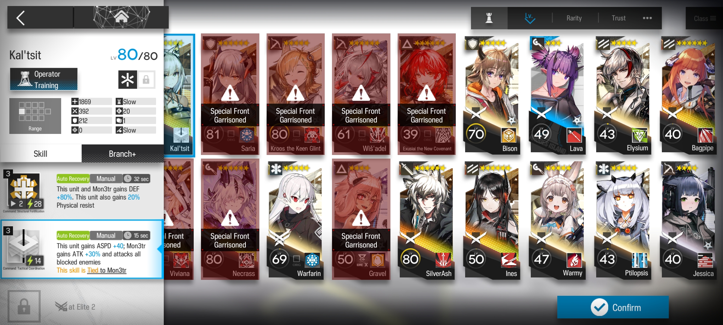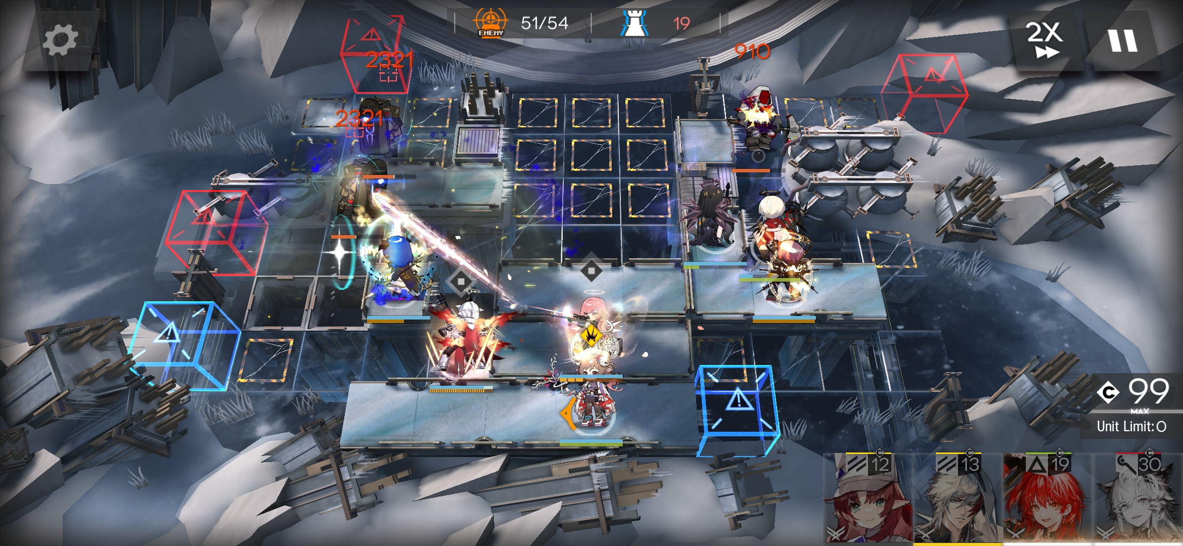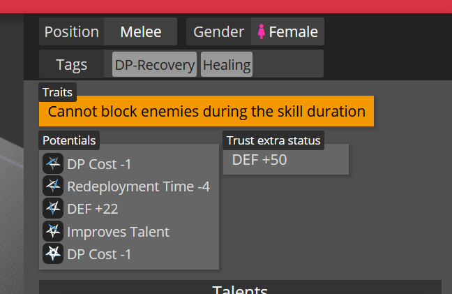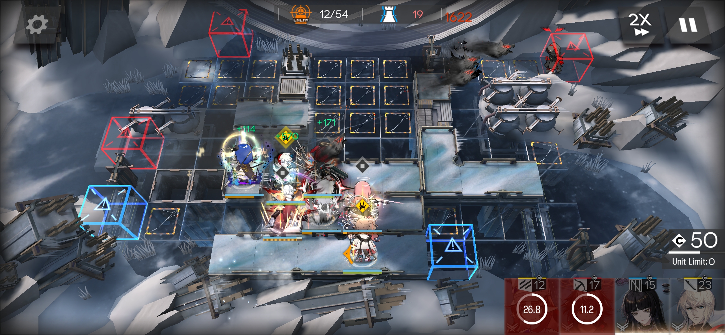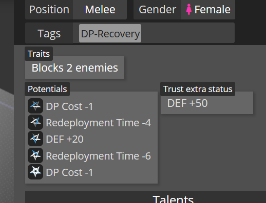 Immediately deals 380% ATK as Physical damage to 6 enemies in front, inflicts Cold and removes Invisible for 6 seconds; Operator closest to 'Eye of the Snowstorm' had its DP cost -11 (Prioritize Guard/Caster/Sniper on the right); Allows operators on the left of 'Eye of the Snowstorm' to cast this skill with their own ATK when deployed (can cast up to 2 times)