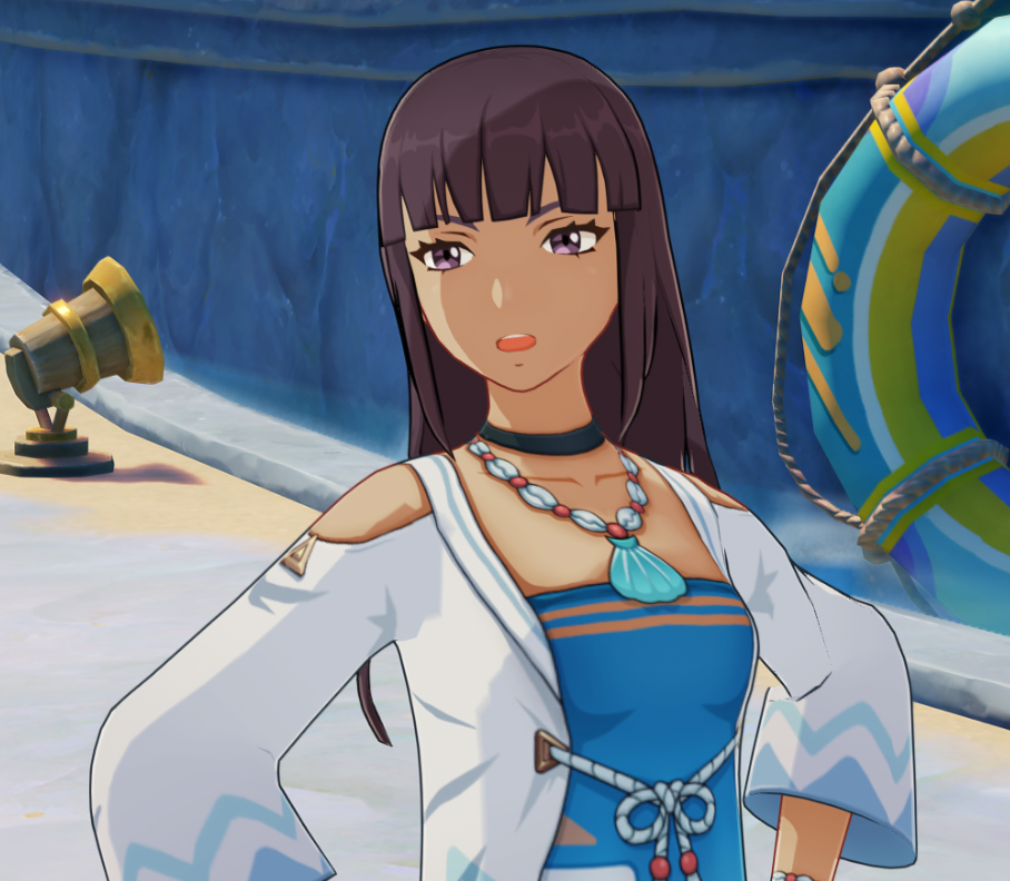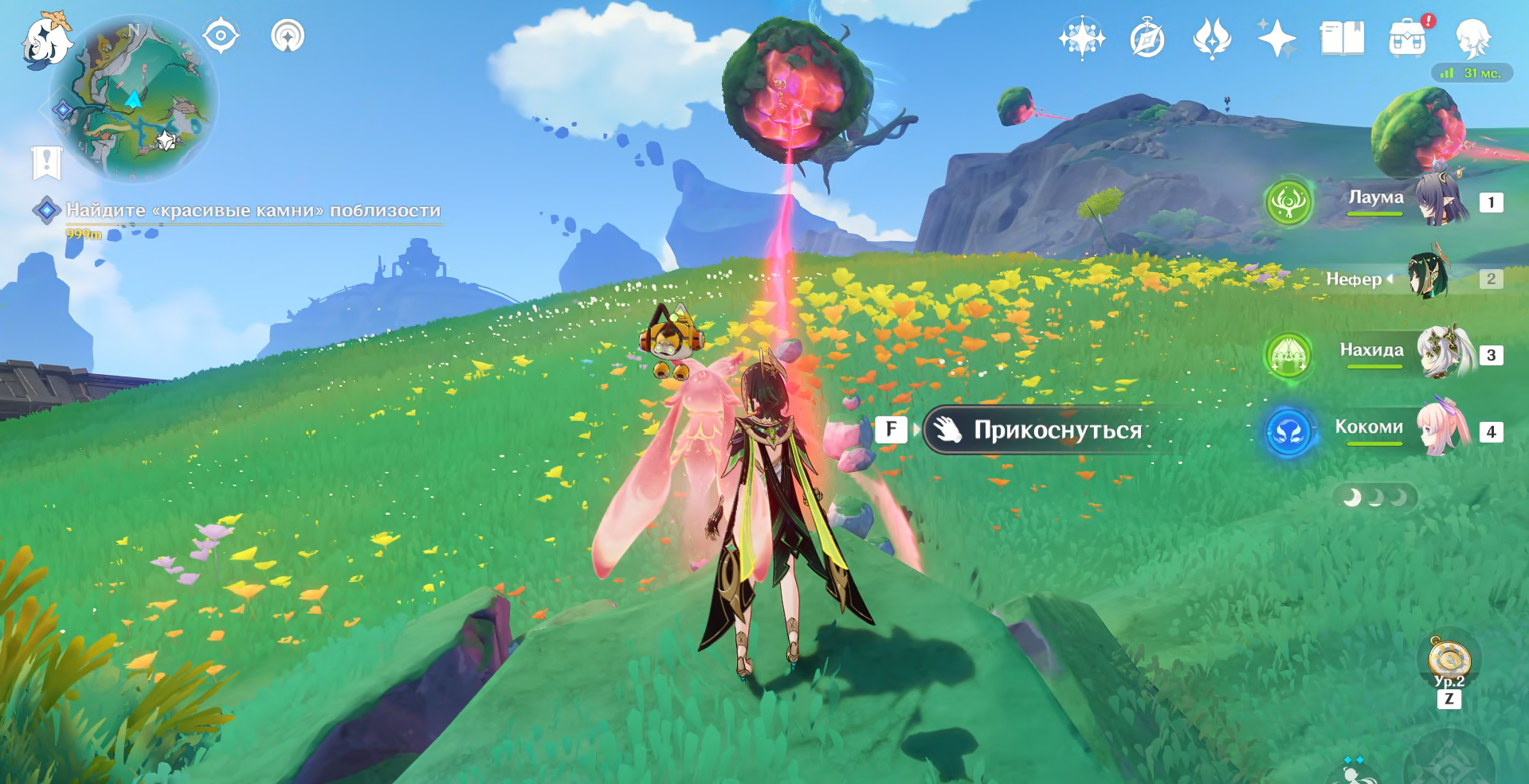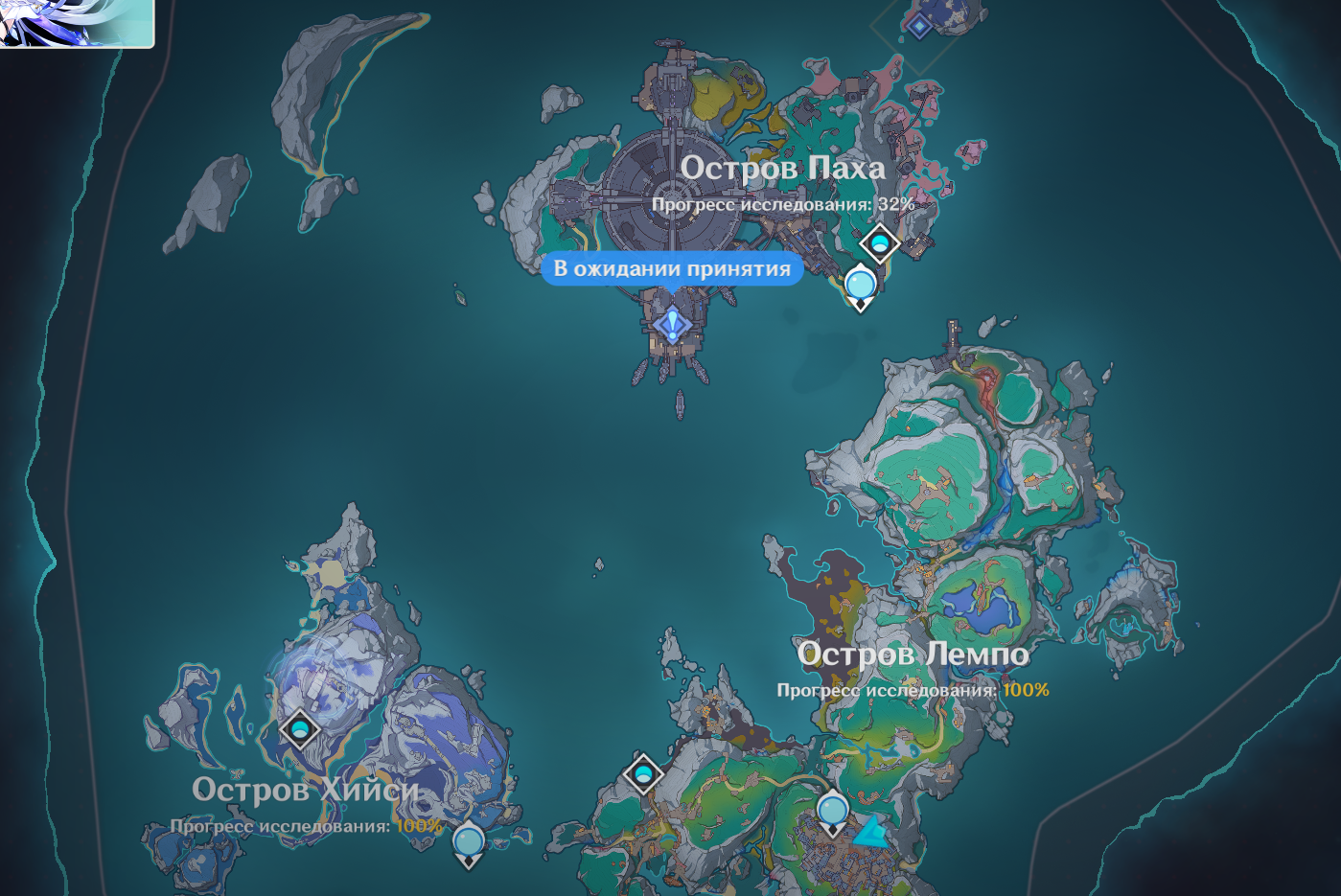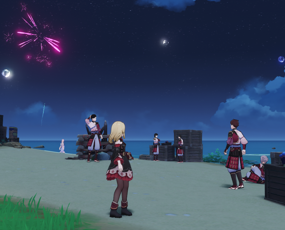 Ну и Кокоми, главнокомандующая, Божественная Жрица, тоже решила посетить пирушку. Но с солдатнёй вместе тусить ей по иерархии не положено, так что она в отдалении на море залипла. Скорее всего смотрит на красный флажок испытания, который я не сделал... спасибо ей, кстати, сейчас пойду свои гемы забирать.