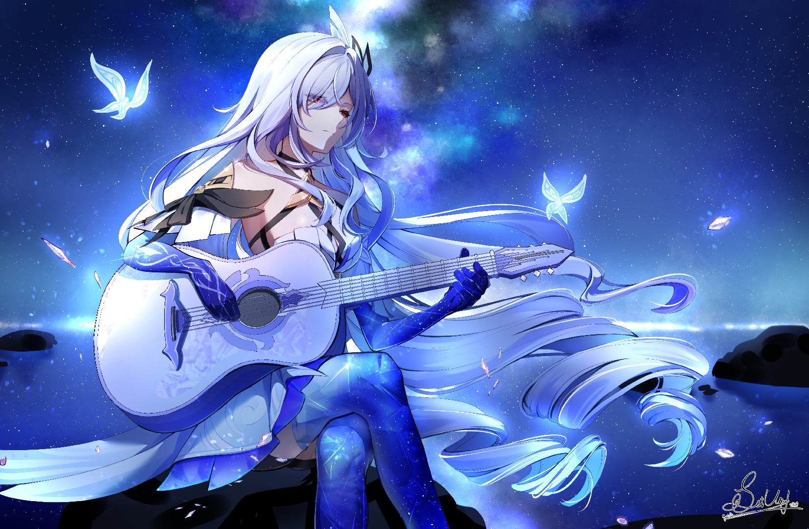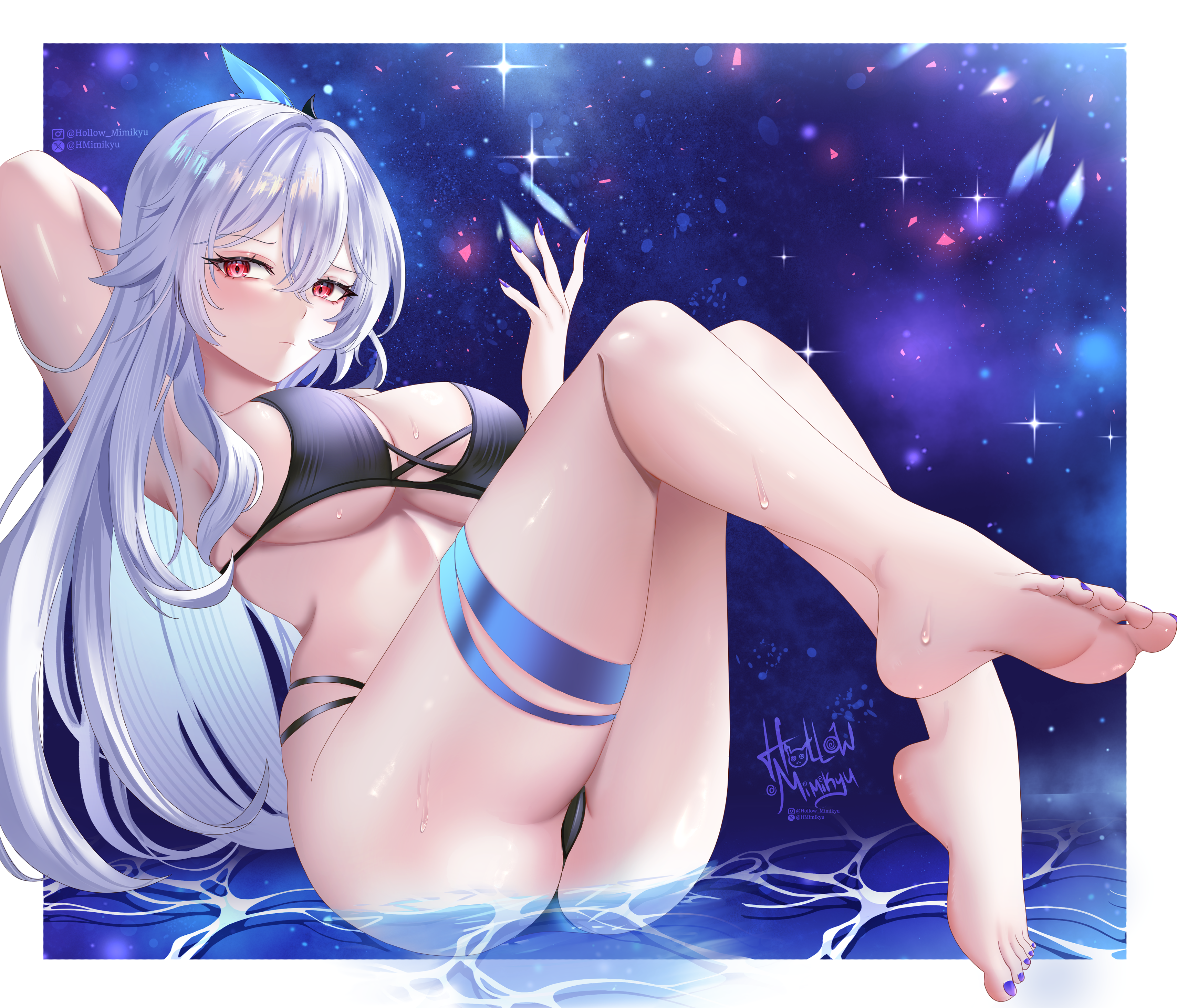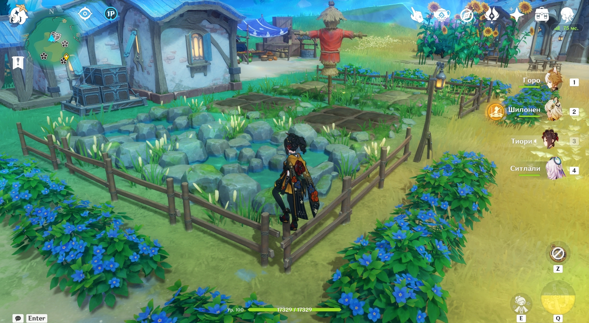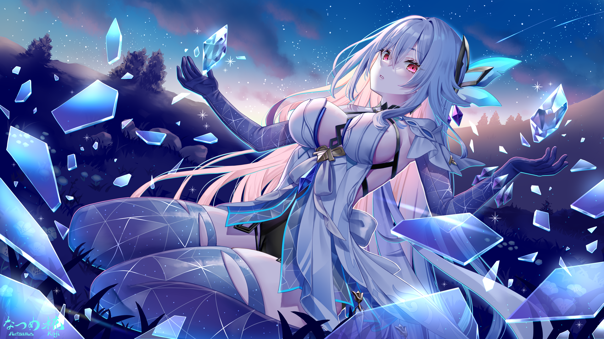 Ну и Кокоми, главнокомандующая, Божественная Жрица, тоже решила посетить пирушку. Но с солдатнёй вместе тусить ей по иерархии не положено, так что она в отдалении на море залипла. Скорее всего смотрит на красный флажок испытания, который я не сделал... спасибо ей, кстати, сейчас пойду свои гемы забирать.