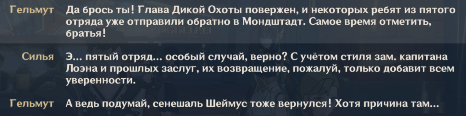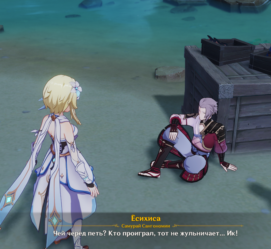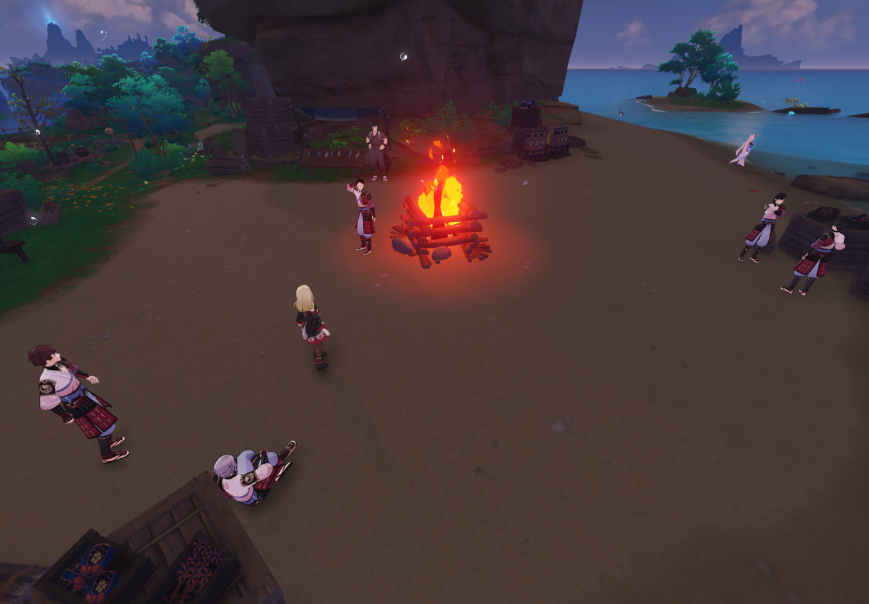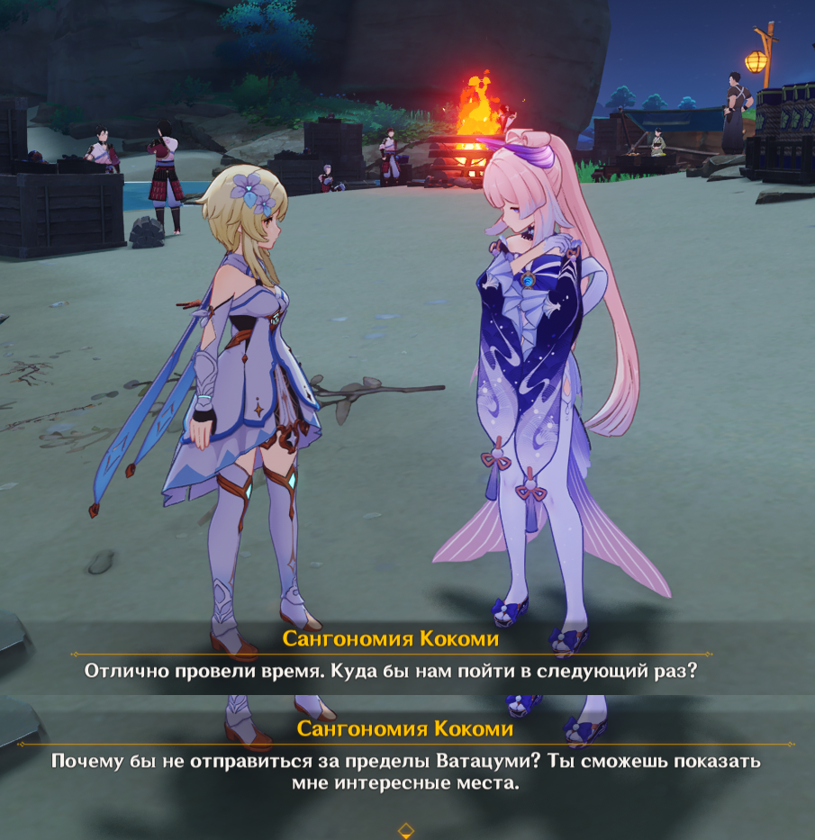 Ёсихиса уже накидаться успел, его даже ноги не держат. Котоку на чилле, всё ещё танцует и пьёт, ему хорошо - умеет отдыхать парень. Рядовой Куча залип и репу чешет рядом с костром, но у него даже имени нет - так что его не фотографирую. Канэда и Сикисама обсуждают алкашку, Канадэ вот конкретно по мондштадскому винишку угарает и имеет крамольные мысли ворваться в Винокурню Рассвет. Когда я подошёл, Сикисама попросил рассказать о приключениях в других странах. Ох, я бы ему с удовольствием рассказал про душный Саберуз, но диалоговые реплики, увы, не позволяют.