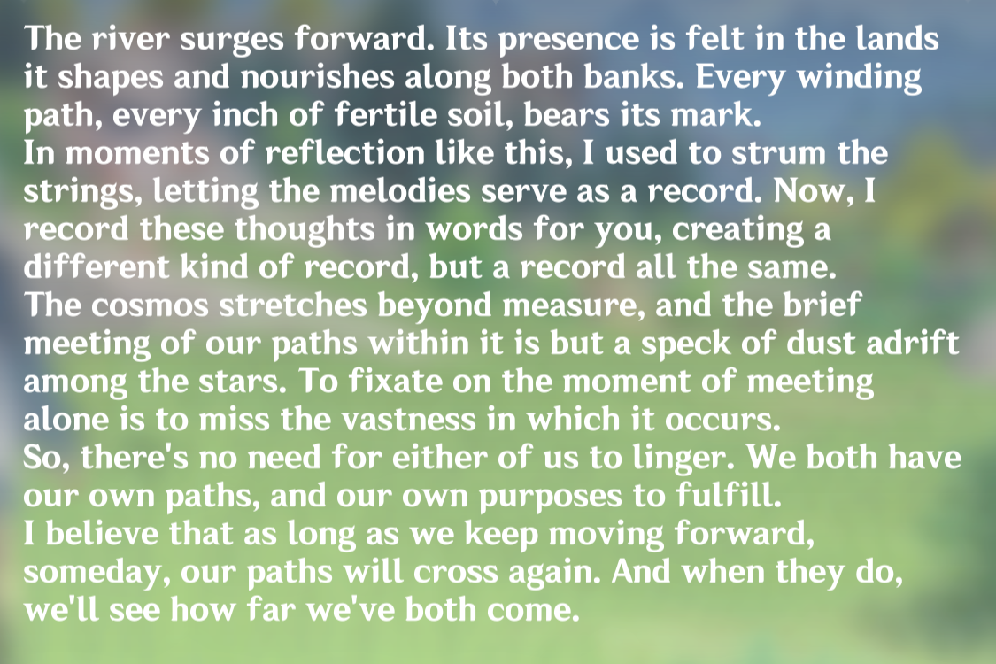 В общем приятная встреча, очень ламповая - вот такие они должны быть. А ведь я даже Ватацуми не люблю - единственная инадзумская лока, которая на 80% у меня закрыта. Кокоми тоже не крутил, не особо персонаж привлекает... Но вот такие вот моменты - в них и чувствуется игровая жизнь.