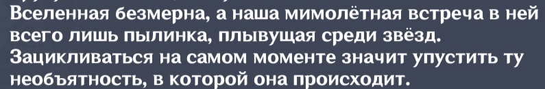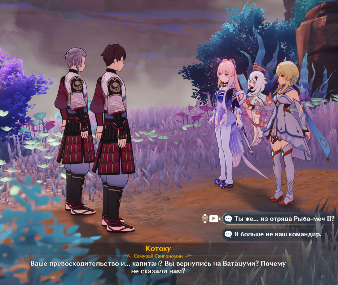 Сейчас встреча с Кокоми в Ватацуме была - вот это тот самый пример ламповых встреч, которые и должны быть в игре. Во-первых общение с самой Кокоми было приятным, затрагивая чувственные тема. А во вторых пришли пацаны из моего отряда Рыба-меч 2. И вот это классно. Мне вообще нравится такое взаимодействие игрока с миром, где он не просто проходящий мимо крокодил, а вплетённый в социальную систему. Мне, например, до сих пор нравится, когда меня невзначай почётным рыцарем Ордо Фавониус называют.