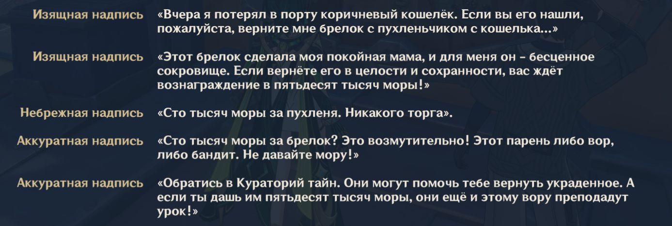 1. К Шень Хэ подкатывали на концерте и на работе, безуспешно. Ху Тао так же упоминала, что завидует внешности Шэнь Хэ и хочет стать в будущем похожей на неё. 2. Альбедо называли внешне привлекательным какие-то мондштадтские женщины, несмотря на то что он гомункул. 3. Статуя ворона сохнет по Моне. 4. У мистера Делюкса есть личная воздыхательница, она ещё в Паралогизме упоминалась. 5. В тюрьме есть женщина, которая села чтобы полюбоваться Нёвиллетом на судебном заседании. 6. Улыбчивый Янь Сяо говорил, что Сяо (не который улыбчивый, а играбельный) красивый и его так называют. 7. Аято называли красивым какие-то женщины в комиссии. 8. Чайлда называли "претти боем", но это может быть подъёбка. 9. На цыгана без коня Кэйю вешаются женщины. 10. Странника (уже после Ирминсуль-инцидента) в Академии называют симпатичным мальчиком с тяжёлым характером и устраивают сюрприз-вечеринки. И вообще по канону он красивый, мамка таким сделала. 11.Про Кавеха говорили, что он на мамку похож и что мамка у него красивая. 12. У деда в описании, что он красивый. 13. Дэхъя считается сумерской красавицей, и среди наёмников это обсуждается. 14. Нин Гуан называли красавицей, где-то среди неписей Ли Юэ точно было, и среди секретарш. Одна представляет её без одежды. 15. Похитители сокровищ называли Байду "красоткой с повязкой". 16. Син Цю описывается как "прекрасный юноша". 17. Нилу называют "сошедшей со сказок" или что-то в этом роде, мол сказочная красота, всякие пассажиры у театра. 18. Дотторе во времена Академии (когда был Зандиком) считался привлекательным среди студенток, одна даже за ним пошла в поход. 19. Сяо описывали как "прекрасного героя". Мол, ослепительно прекрасен, как герой сошедший со страниц книги или что-то типо того. 20. Была некая девушка из описания артефактов, у которой "В волосы её были вплетены фантастической красоты перья, да и сама она будто вышла из сна". По описанию очень подходит Колумбина. 21. На корабле Бэй Доу есть женщина, которая, согласно слов какого-то пацана из команды, "закрывается у себя в каюте и повторяет много раз её имя"