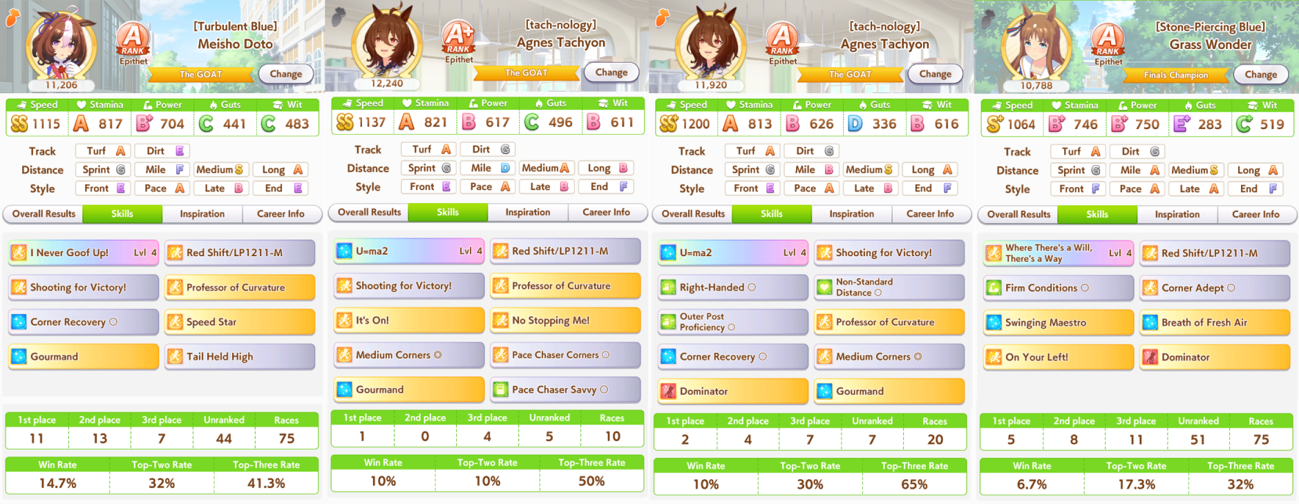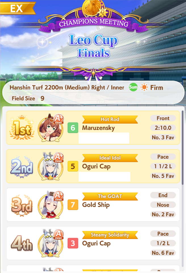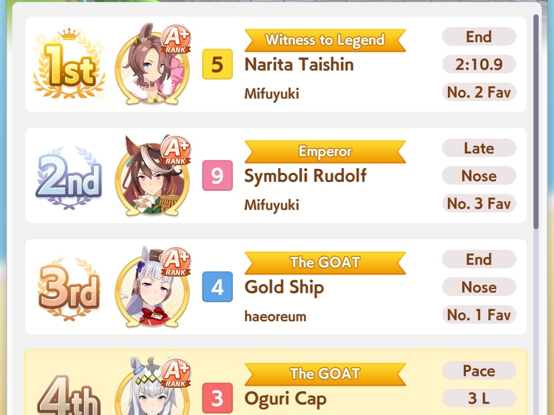 Я понимаю, что мета из глаз каждого относительна, но после очевиднейшей имба Марузи, Огури была топ 2 лошадью турнира. Кто бы мог подумать. Энды и Голши топ 3 по распространённости в забегах и также очень сильная была и часто побеждала. Протыки сосатб.