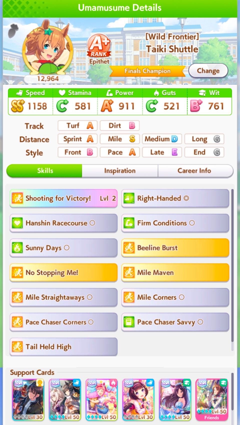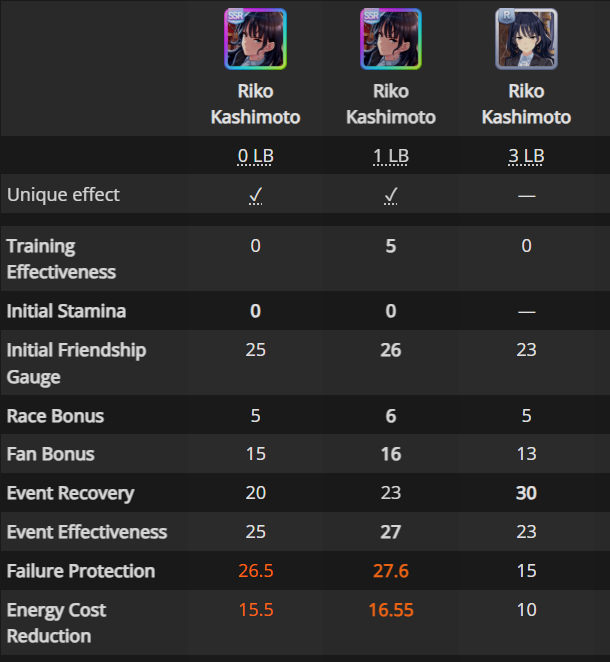 >>5874205 Почему ты арендуешь 45 Китасан, она в 2 раза хуже приоритет тренировок имеет чем 50. Поставь Урару бесплатную вместо Эйшин Флэш, она статов даст сильно больше засчет эффективности тренировок. За халявные крутки собирай серую Рико Кашимото, как добьешь её до млб ставишь её в любую колоду на протяжении сценария. Еще жопой чую арендный родитель - кусок говна, тебе нужен 9 звездный на стамину/павер с 6+ ура финалов спарков (ищи через хроногенезис).