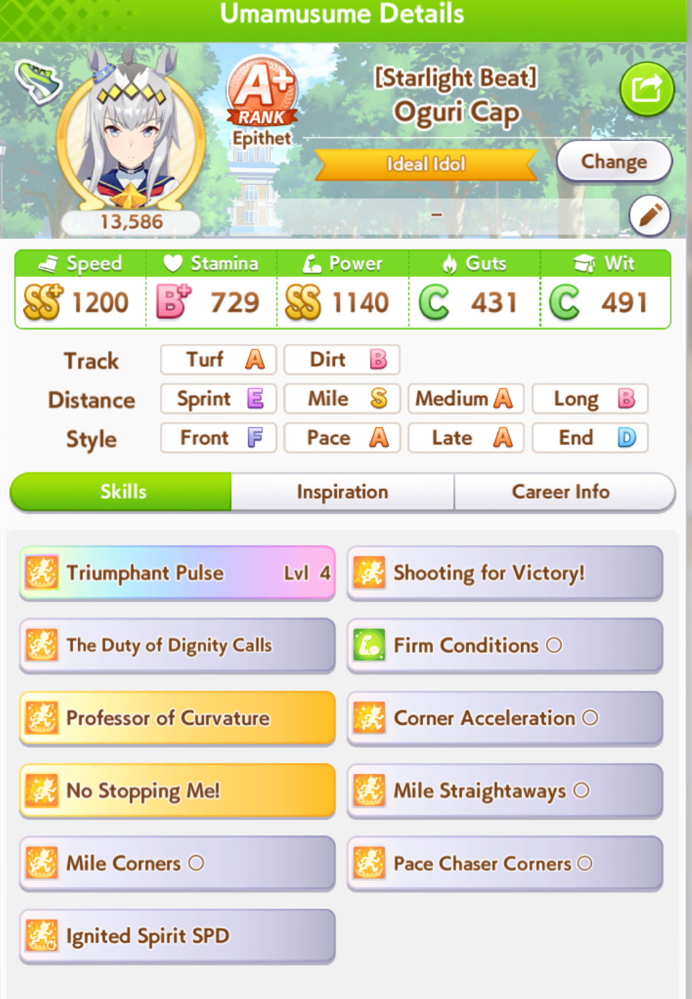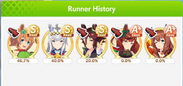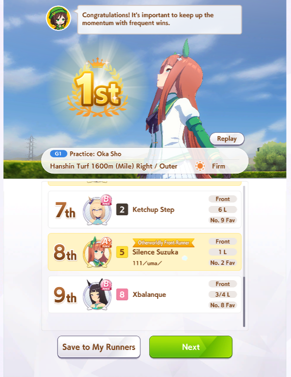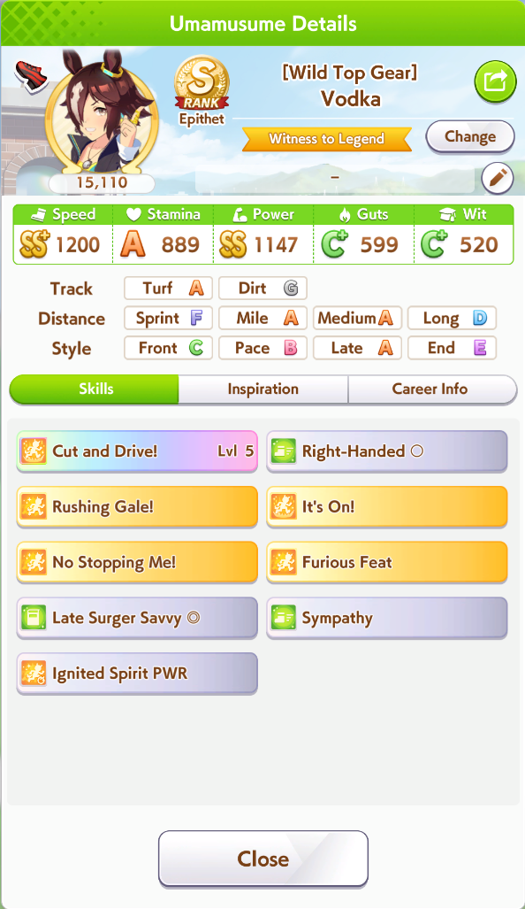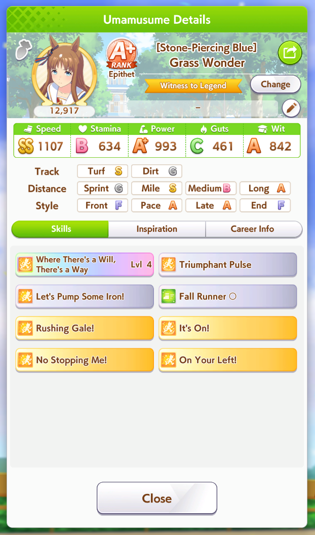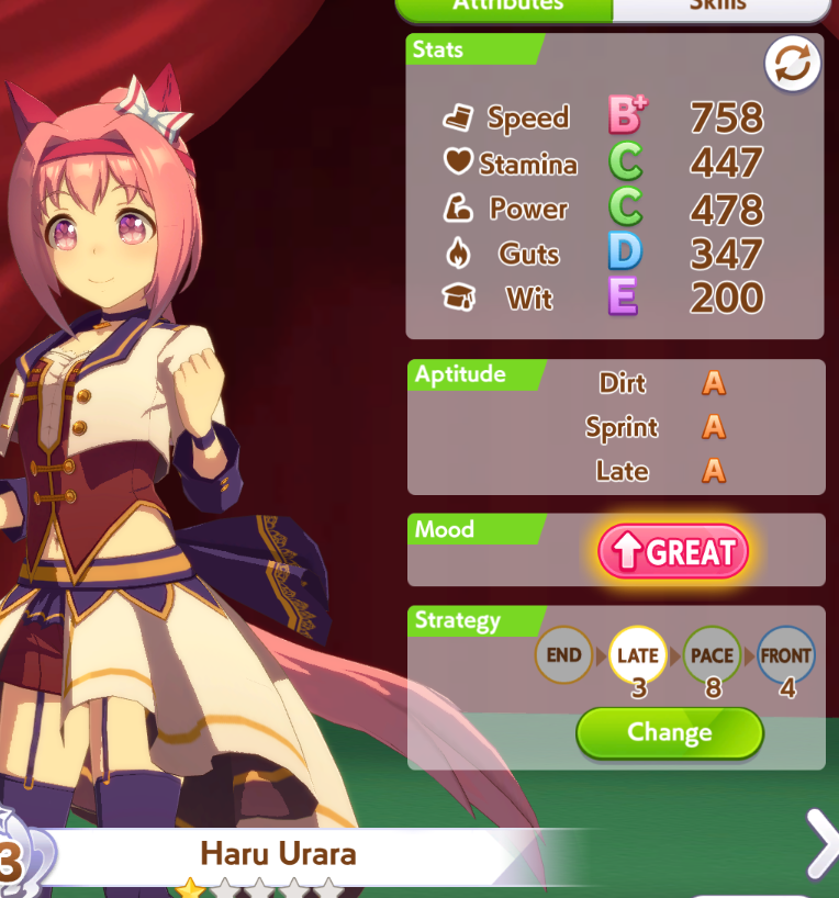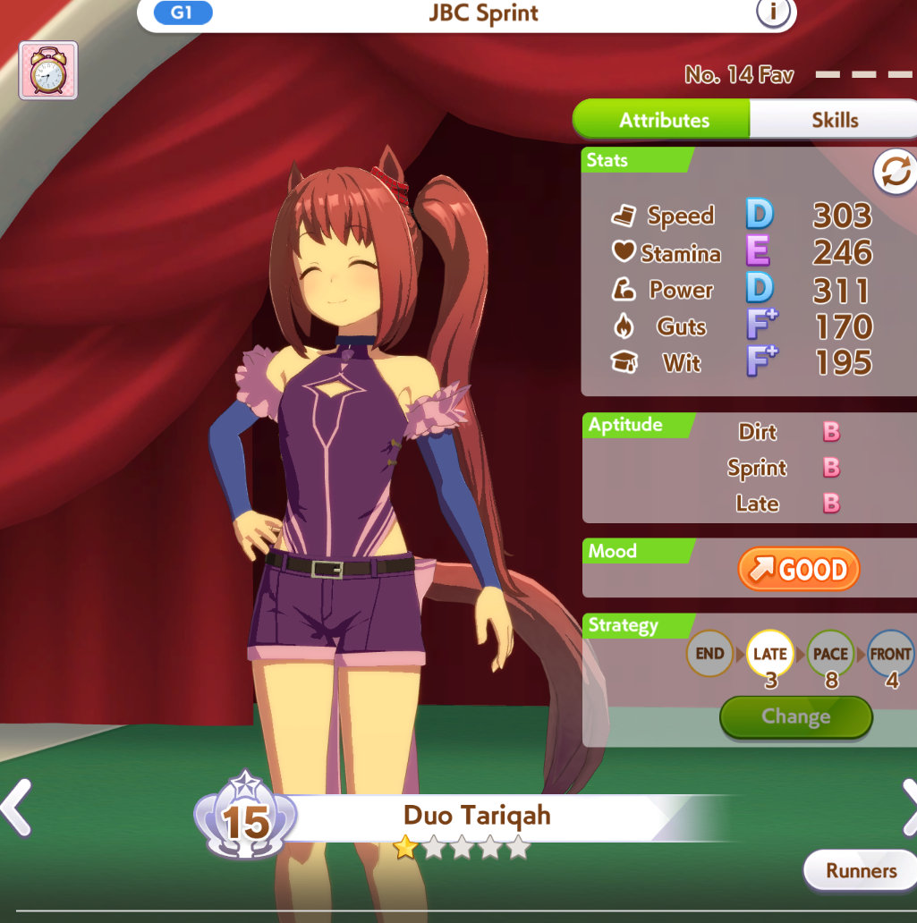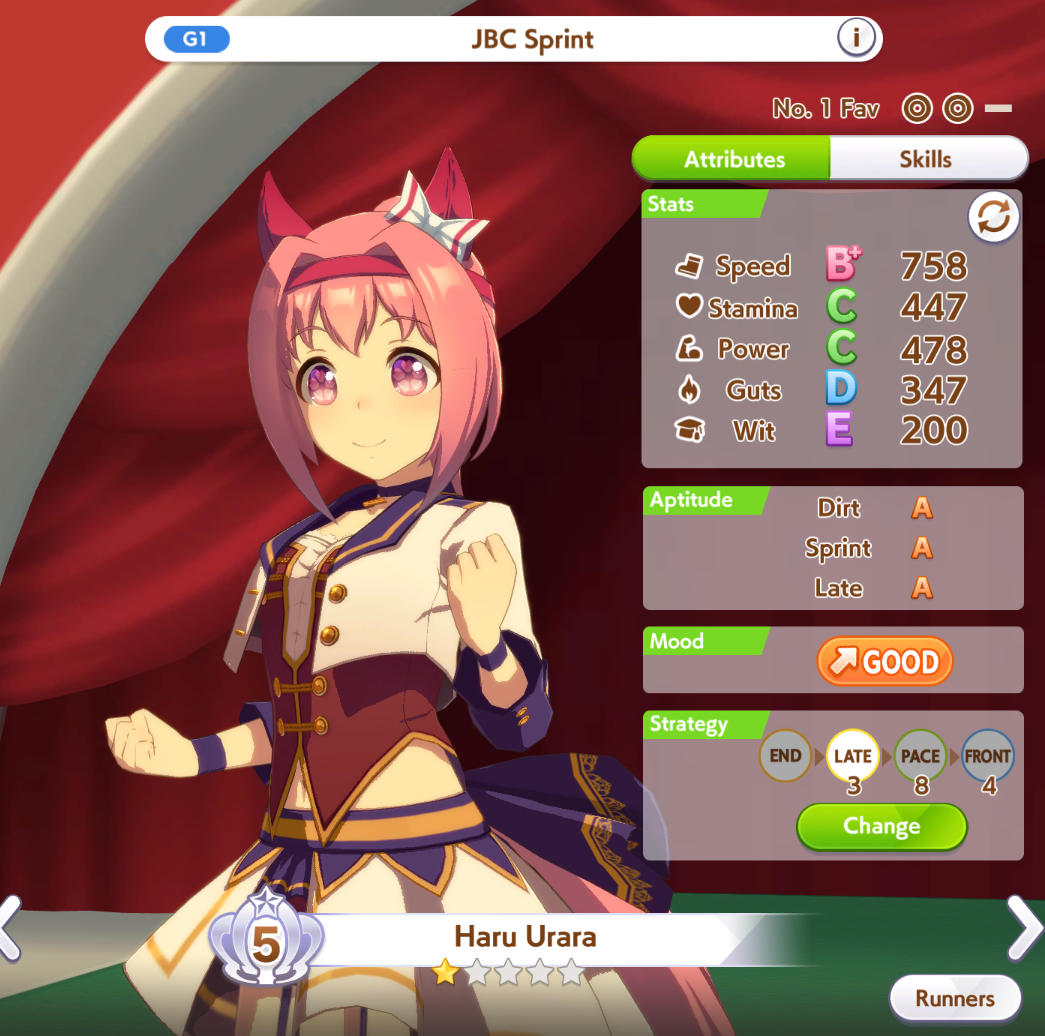 Ну такое зачем-то пролез в А лигу, когда после семи просёров подряд мои умы зачем-то побеждать решили. Ну правда первые пять можно сказать не основной состав бегал, так взял тех кто не очень вышел чисто посмотреть. Но ебут прямо жестко, это да. Если меньше 1к спида и 500 гатса, то лошади прямо отлетают на финише. Пару раз моя Спе прямо на ногтях первое место выцарапывала. Ей бы статы конечно по больше чуть-чуть, а так только надеяться что у противников ускорялки поздно включатся из-за низкого вита или бад муда. Ну и Грув один раз даже победила, еще бы ей самой бэд муд по реже кидало, так то единственная моя А+ в принципе, но бежит она странно. Постоянно отстаёт чуть ли не до лэйтеров и бежит в конце пака, особенно когда в забеге куча пэйсеров. Понял кому тот навык с карточки Браян подойдёт, ей точно, а то задолбала в конце бежать делая вид что она лэйтер, можно ей еще и помп айрон взять ради лулзов тогда лол, гемблить так гемблить. Посмотрим. По хорошему надо перекачивать хотя бы половину тимы, а лучше всех, но не уверен что смогу.