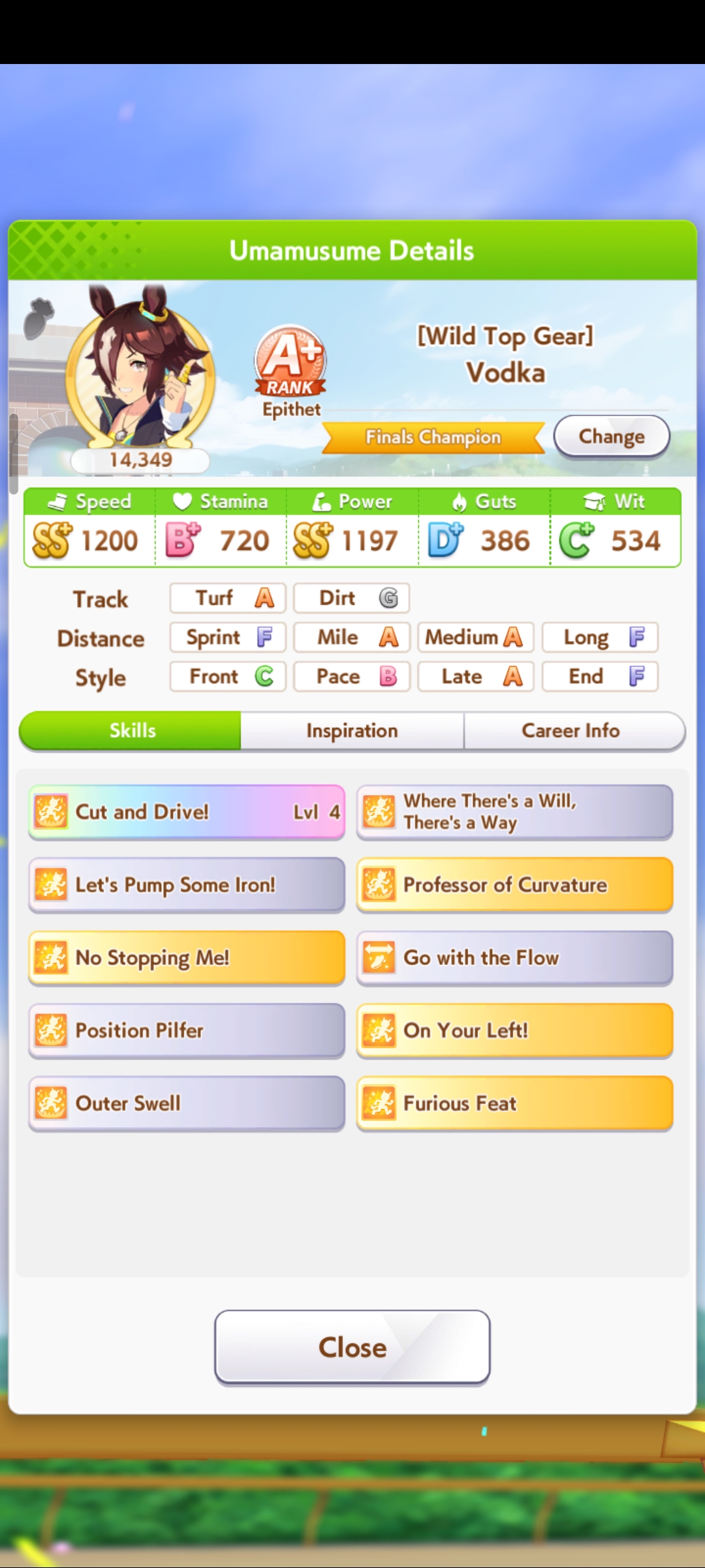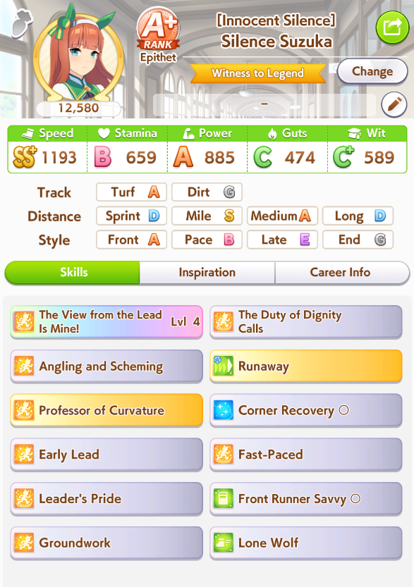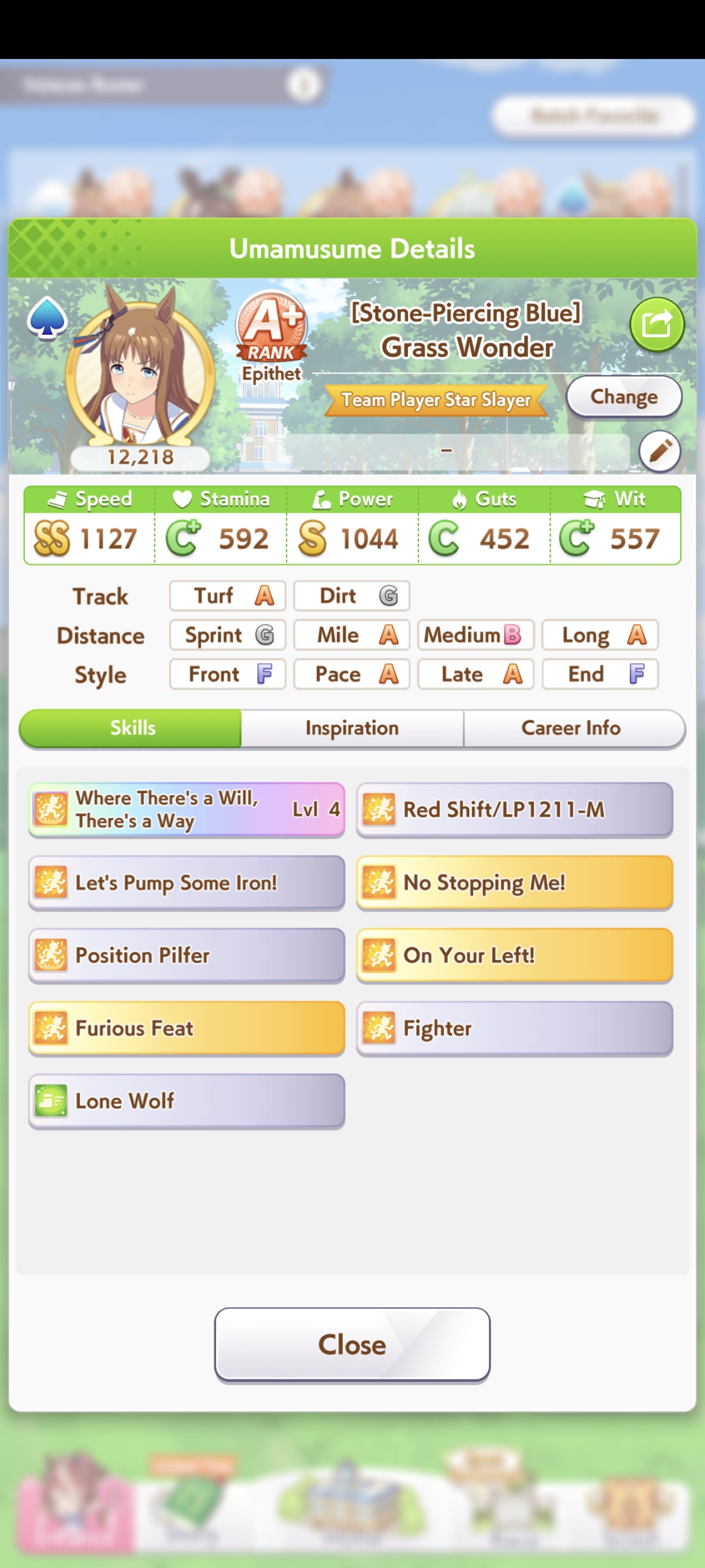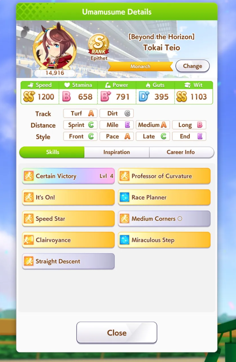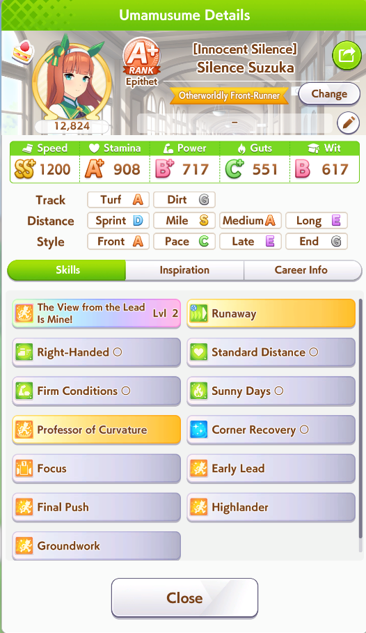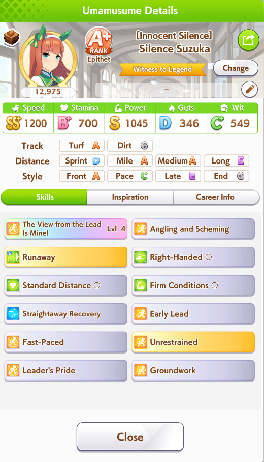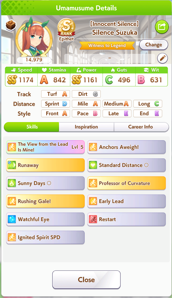 Ну такое зачем-то пролез в А лигу, когда после семи просёров подряд мои умы зачем-то побеждать решили. Ну правда первые пять можно сказать не основной состав бегал, так взял тех кто не очень вышел чисто посмотреть. Но ебут прямо жестко, это да. Если меньше 1к спида и 500 гатса, то лошади прямо отлетают на финише. Пару раз моя Спе прямо на ногтях первое место выцарапывала. Ей бы статы конечно по больше чуть-чуть, а так только надеяться что у противников ускорялки поздно включатся из-за низкого вита или бад муда. Ну и Грув один раз даже победила, еще бы ей самой бэд муд по реже кидало, так то единственная моя А+ в принципе, но бежит она странно. Постоянно отстаёт чуть ли не до лэйтеров и бежит в конце пака, особенно когда в забеге куча пэйсеров. Понял кому тот навык с карточки Браян подойдёт, ей точно, а то задолбала в конце бежать делая вид что она лэйтер, можно ей еще и помп айрон взять ради лулзов тогда лол, гемблить так гемблить. Посмотрим. По хорошему надо перекачивать хотя бы половину тимы, а лучше всех, но не уверен что смогу.