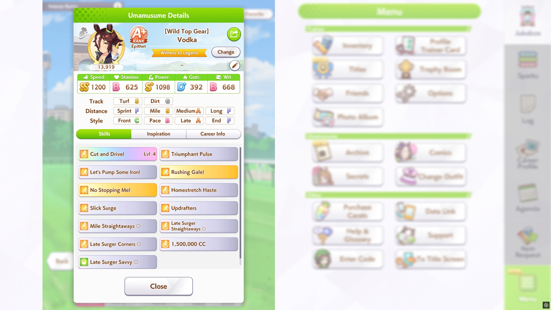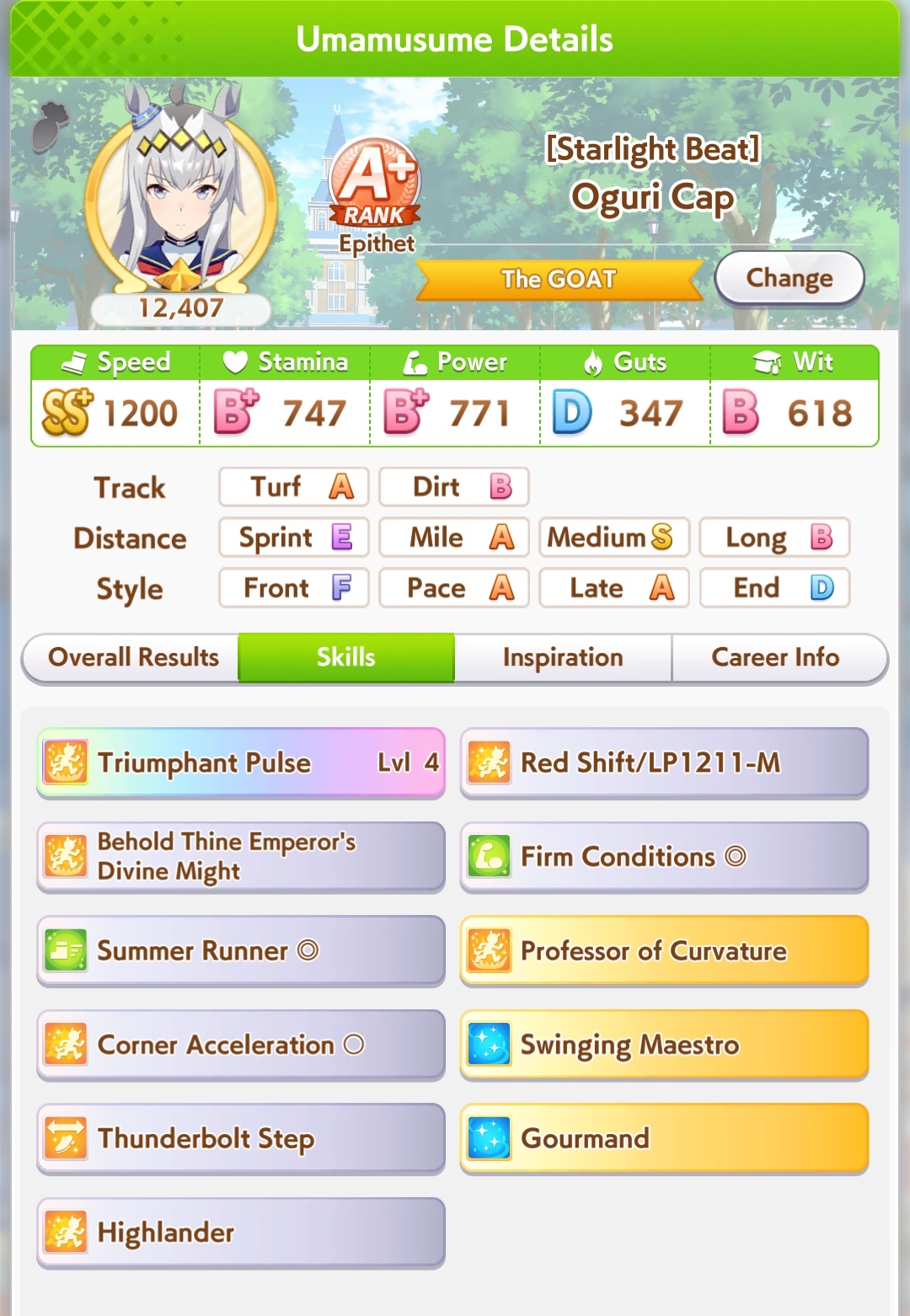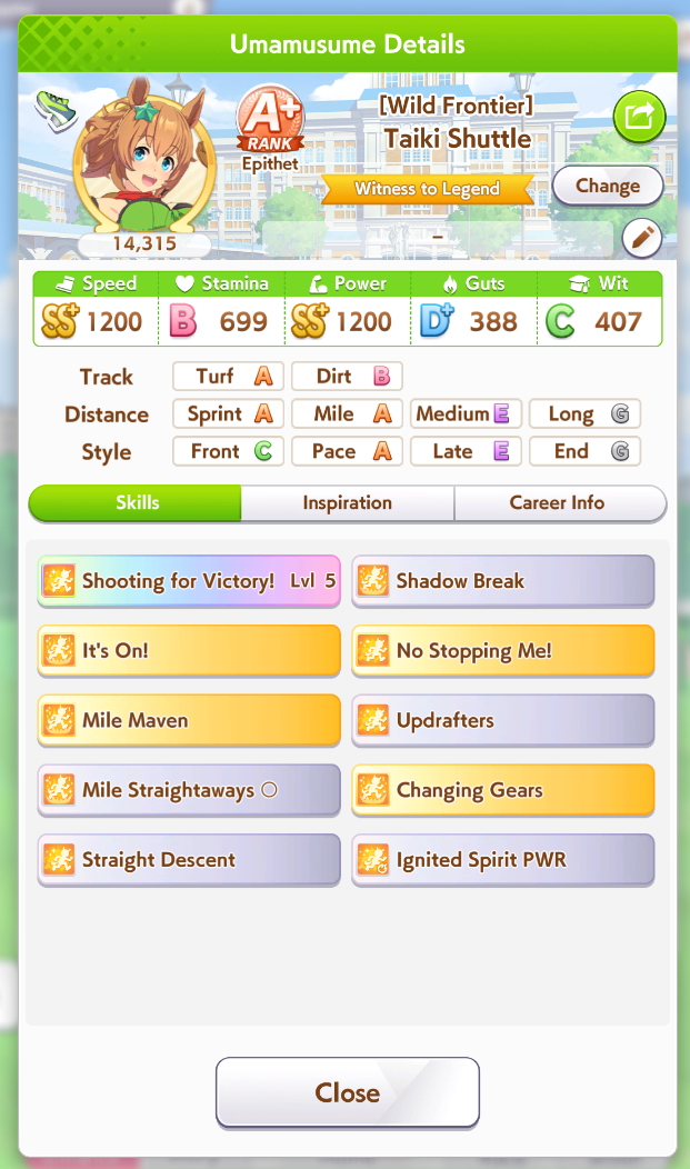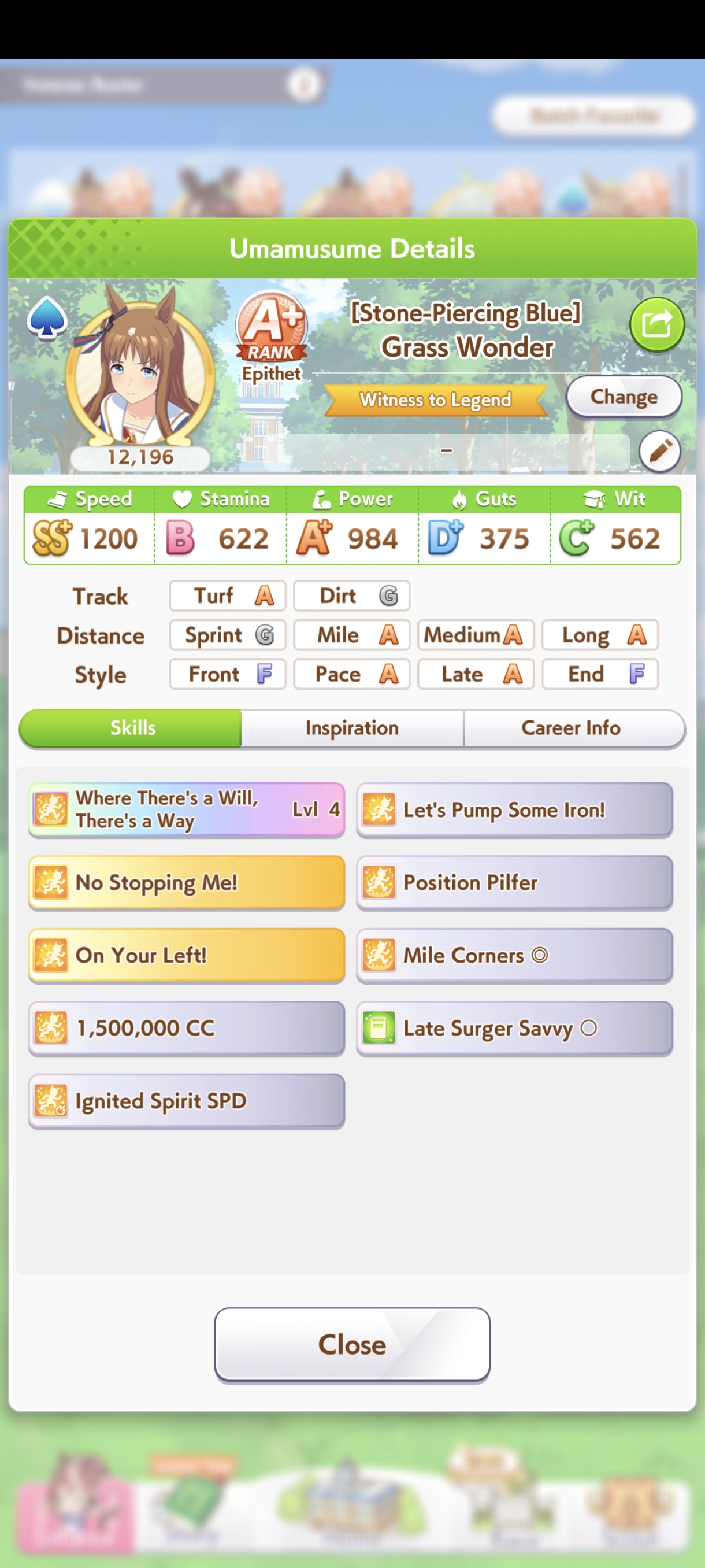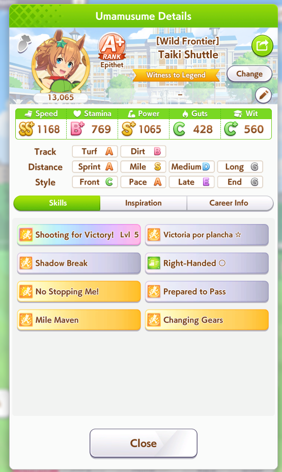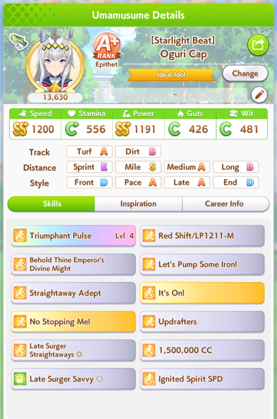 Ну такое зачем-то пролез в А лигу, когда после семи просёров подряд мои умы зачем-то побеждать решили. Ну правда первые пять можно сказать не основной состав бегал, так взял тех кто не очень вышел чисто посмотреть. Но ебут прямо жестко, это да. Если меньше 1к спида и 500 гатса, то лошади прямо отлетают на финише. Пару раз моя Спе прямо на ногтях первое место выцарапывала. Ей бы статы конечно по больше чуть-чуть, а так только надеяться что у противников ускорялки поздно включатся из-за низкого вита или бад муда. Ну и Грув один раз даже победила, еще бы ей самой бэд муд по реже кидало, так то единственная моя А+ в принципе, но бежит она странно. Постоянно отстаёт чуть ли не до лэйтеров и бежит в конце пака, особенно когда в забеге куча пэйсеров. Понял кому тот навык с карточки Браян подойдёт, ей точно, а то задолбала в конце бежать делая вид что она лэйтер, можно ей еще и помп айрон взять ради лулзов тогда лол, гемблить так гемблить. Посмотрим. По хорошему надо перекачивать хотя бы половину тимы, а лучше всех, но не уверен что смогу.