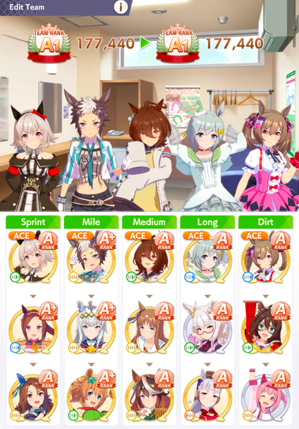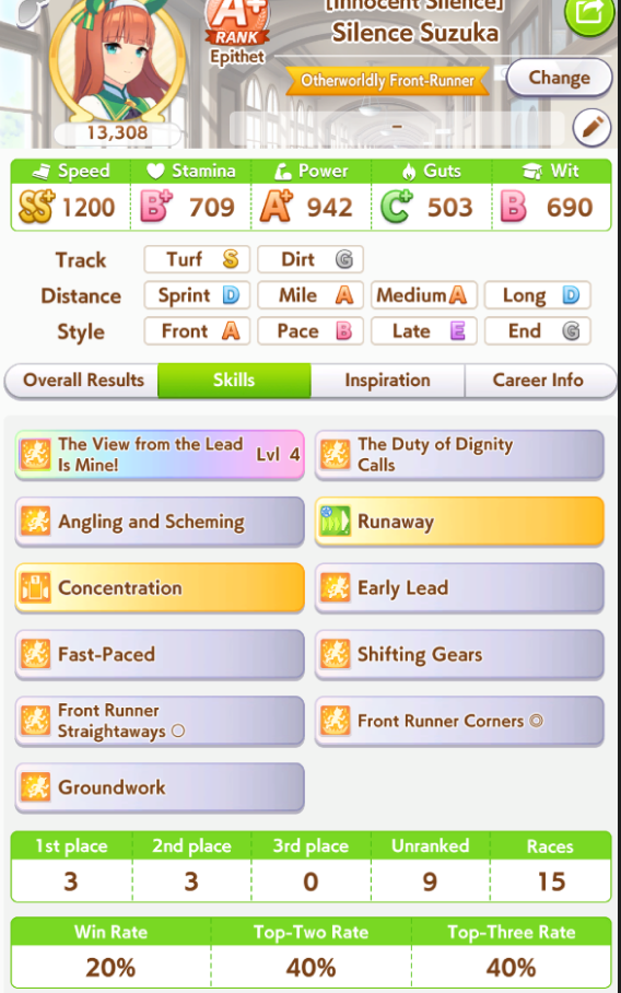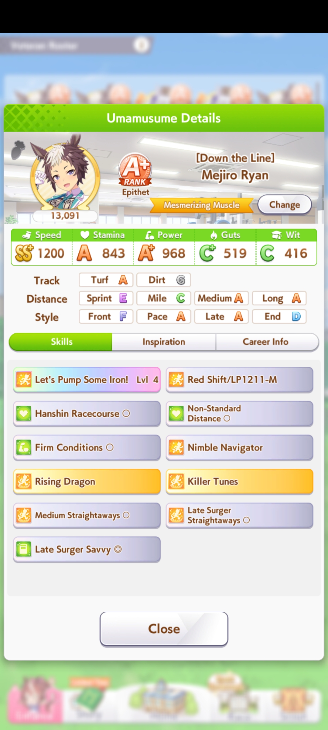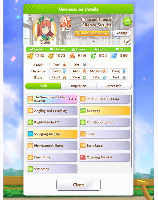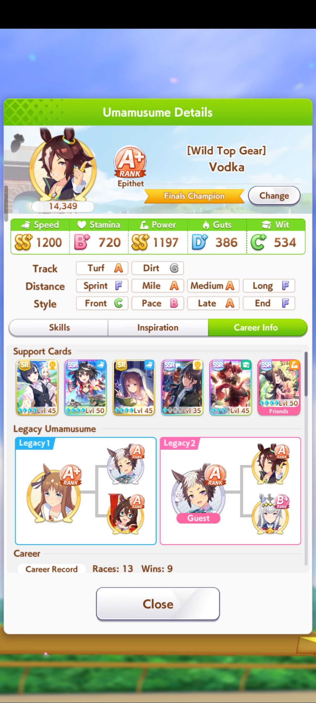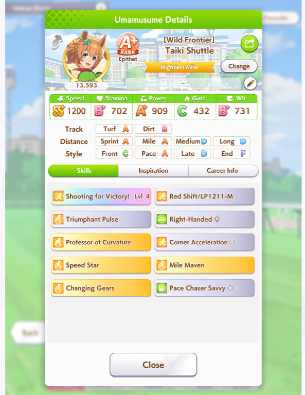 Ну такое зачем-то пролез в А лигу, когда после семи просёров подряд мои умы зачем-то побеждать решили. Ну правда первые пять можно сказать не основной состав бегал, так взял тех кто не очень вышел чисто посмотреть. Но ебут прямо жестко, это да. Если меньше 1к спида и 500 гатса, то лошади прямо отлетают на финише. Пару раз моя Спе прямо на ногтях первое место выцарапывала. Ей бы статы конечно по больше чуть-чуть, а так только надеяться что у противников ускорялки поздно включатся из-за низкого вита или бад муда. Ну и Грув один раз даже победила, еще бы ей самой бэд муд по реже кидало, так то единственная моя А+ в принципе, но бежит она странно. Постоянно отстаёт чуть ли не до лэйтеров и бежит в конце пака, особенно когда в забеге куча пэйсеров. Понял кому тот навык с карточки Браян подойдёт, ей точно, а то задолбала в конце бежать делая вид что она лэйтер, можно ей еще и помп айрон взять ради лулзов тогда лол, гемблить так гемблить. Посмотрим. По хорошему надо перекачивать хотя бы половину тимы, а лучше всех, но не уверен что смогу.